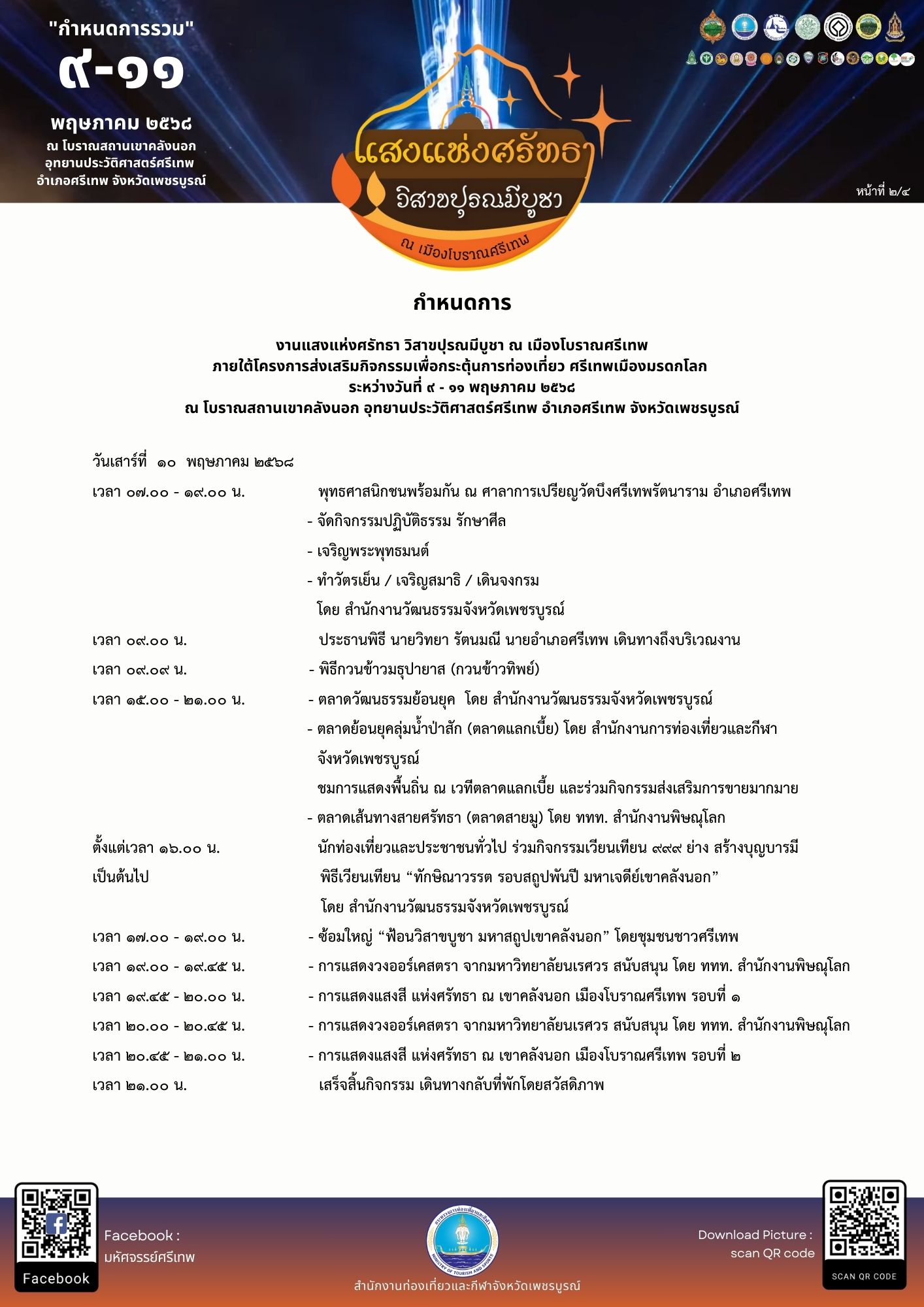 จังหวัดเพชรบูรณ์ โดยสำนักงานการท่องเที่ยวและกีฬาจังหวัดเพชรบูรณ์ ร่วมกับหน่วยงานภาครัฐและภาคีเครือข่ายในพื้นที่ ขอเชิญชวนพุทธศาสนิกชนและนักท่องเที่ยวเข้าร่วมงาน “แสงแห่งศรัทธา วิสาขบูรณมีบูชา @เมืองโบราณศรีเทพ” ระหว่างวันที่ 9 - 11 พฤษภาคม 2568 ณ โบราณสถานเขาคลังนอก อุทยานประวัติศาสตร์ศรีเทพ จังหวัดเพชรบูรณ์ เพื่อร่วมเฉลิมฉลองวันวิสาขบูชา หนึ่งในวันสำคัญทางพระพุทธศาสนา และสร้างการรับรู้เกี่ยวกับเมืองมรดกโลกแห่งใหม่ของไทย ร่วมจารึกค่ำคืนแห่งพลังศรัทธา บนผืนแผ่นดินมรดกโลกศรีเทพ กับกิจกรรมหลากหลาย ได้แก่ การแสดงแสงเสียง “เขาคลังนอก” ผสานวงออร์เคสตรา, พิธีเวียนเทียน “ทักษิณาวรรต รอบสถูปพันปี”, ฟ้อนวิสาขบูชา มหาสถูปเขาคลังนอก, เส้นทางสายศรัทธา (สายมูเตลู) สักการะสิ่งศักดิ์สิทธิ์เมืองโบราณ, ตลาดย้อนยุควัฒนธรรม - ตลาดแลกเบี้ยลุ่มน้ำป่าสัก รวมทั้งยังมีจุดถ่ายรูปสุดว้าว อาหารพื้นถิ่น ของดีชุมชน และกิจกรรมร่วมสมัยมากมาย สามารถติดตามรายละเอียดกิจกรรมได้ทาง Facebook มหัศจรรย์ศรีเทพ https://www.facebook.com/AmazingSiThep