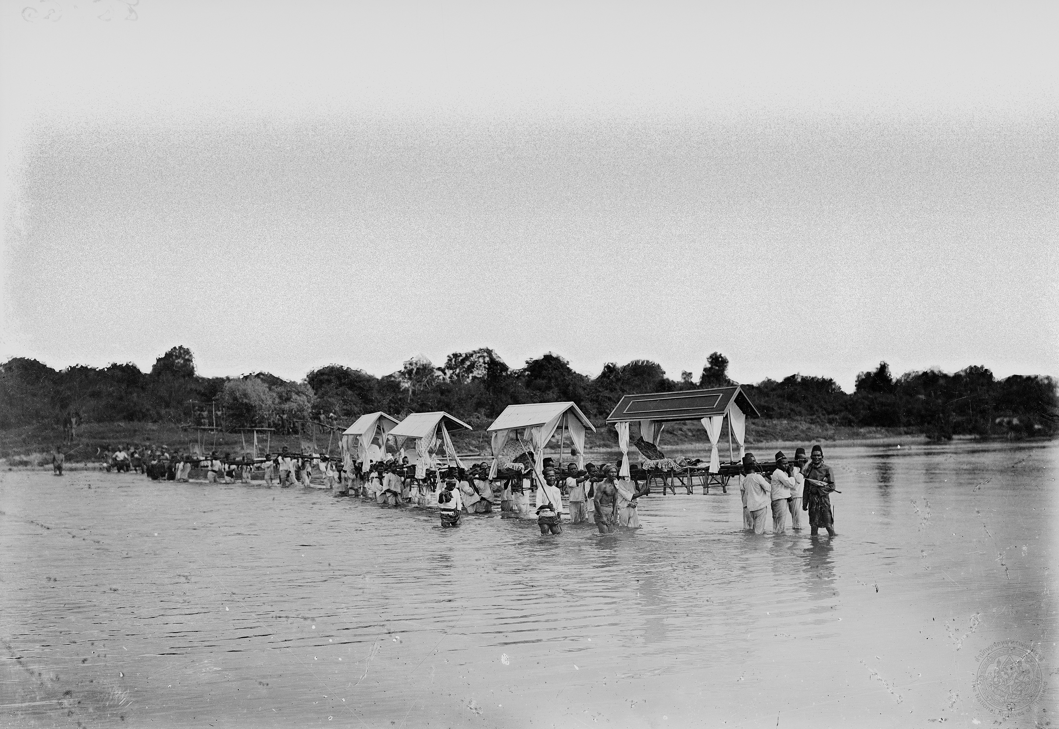 ภาพ : กระบวนวอของหม่อมและพระธิดาที่ตามเสด็จพระเจ้าน้องยาเธอ กรมหลวงดำรงราชานุภาพ เสนาบดีกระทรวงมหาดไทย กำลังข้ามแม่น้ำปัตตานี นอกเมืองยะลา ระหว่างเสด็จตรวจราชการมณฑลปักษ์ใต้ เมื่อวันที่ 6 กรกฎาคม พุทธศักราช 2449