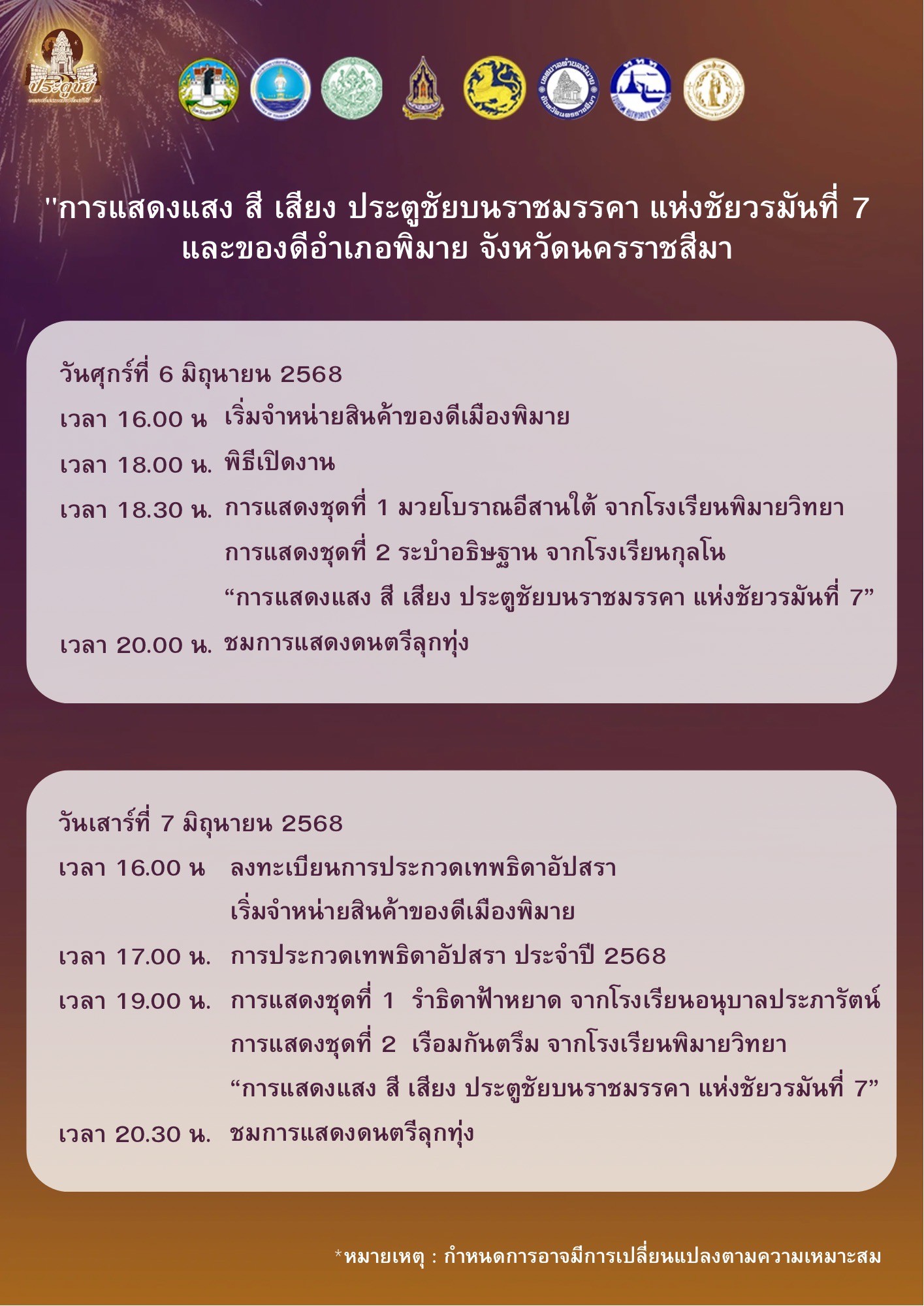อุทยานประวัติศาสตร์พิมาย ขอเชิญร่วมตามรอยอารยธรรม ร่วมย้อนอดีต ชมการแสดง แสง สี เสียง ในงาน "ประตูชัย บนราชมรรคาแห่งชัยวรมันที่ ๗" ระหว่างวันที่ ๖ - ๗ มิถุนายน ๒๕๖๘ ณ บริเวณประตูชัย อำเภอพิมาย จังหวัดนครราชสีมา จัดโดยสำนักงานการท่องเที่ยวและกีฬาจังหวัดนครราชสีมา ร่วมกับอำเภอพิมาย มีไฮไลท์ที่พลาดไม่ได้ ดังนี้ - ชม การแสดง แสง สี เสียง "ประตูชัยบนราชมรรคา แห่งชัยวรมันที่ ๗"