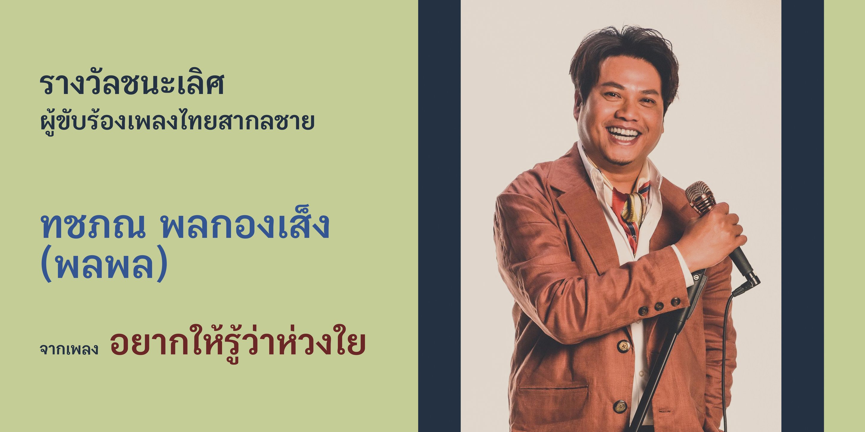 ๑. รางวัลชนะเลิศ ผู้ขับร้องเพลงไทยสากลชาย ได้แก่ นายทชภณ พลกองเส็ง (พลพล พลกองเส็ง) จากเพลง อยากให้รู้ว่าห่วงใย