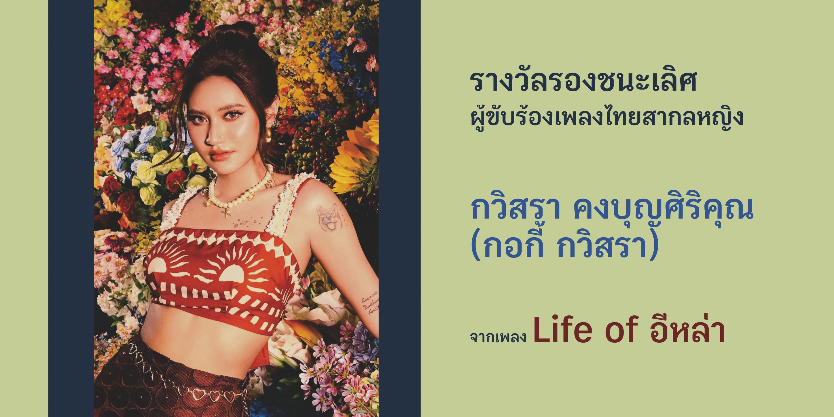 ๔. รางวัลรองชนะเลิศ ผู้ขับร้องเพลงไทยสากลหญิง ได้แก่ นางสาวกวิสรา คงบุญศิริคุณ (กอกี้ กวิสรา) จากเพลง Life of อีหล่า