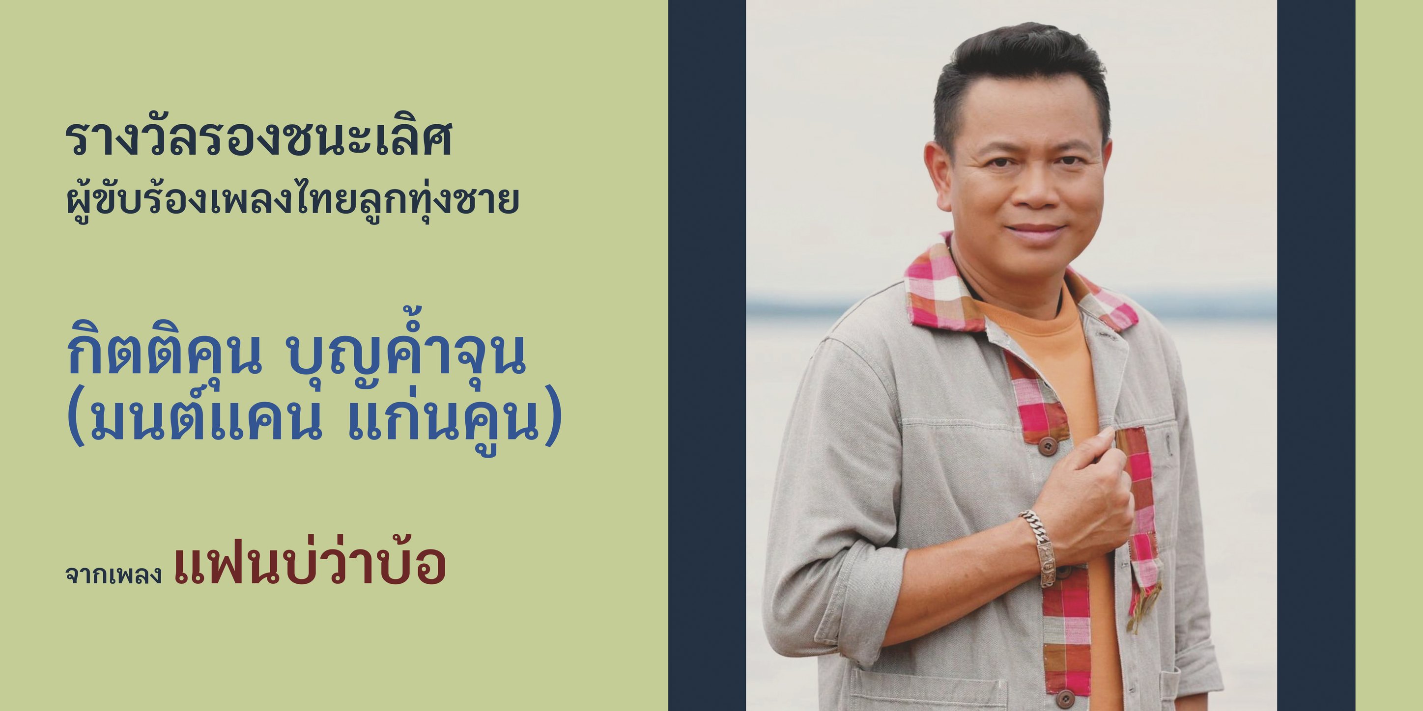 ๖. รางวัลรองชนะเลิศ ผู้ขับร้องเพลงไทยลูกทุ่งชาย ได้แก่ นายกิตติคุน บุญค้ำจุน (มนต์แคน แก่นคูน) จากเพลง แฟนบ่ว่าบ้อ