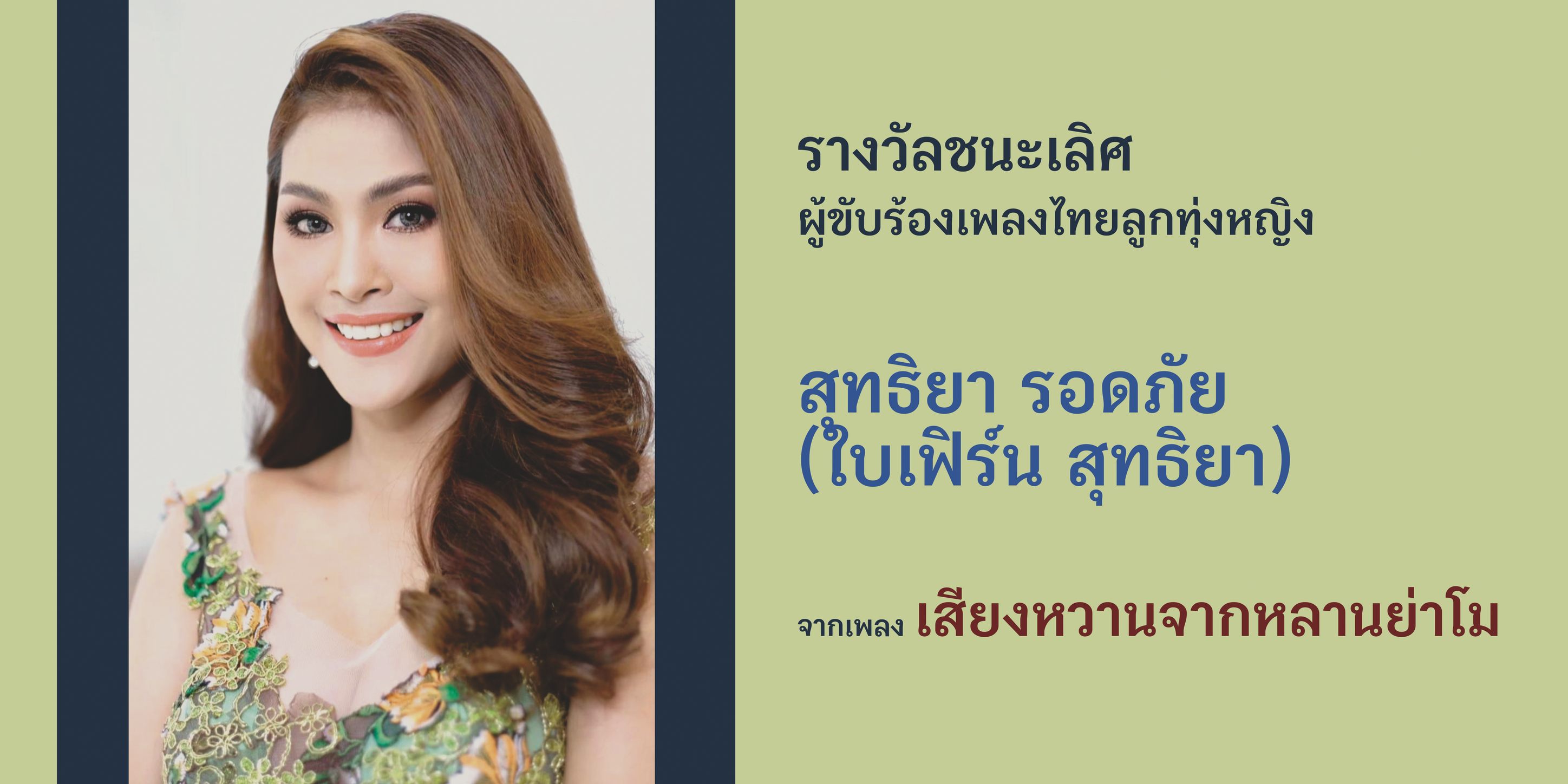 ๗. รางวัลชนะเลิศ ผู้ขับร้องเพลงไทยลูกทุ่งหญิง ได้แก่ นางสาวสุทธิยา รอดภัย (ใบเฟิร์น สุทธิยา) จากเพลง เสียงหวานจากหลานย่าโม