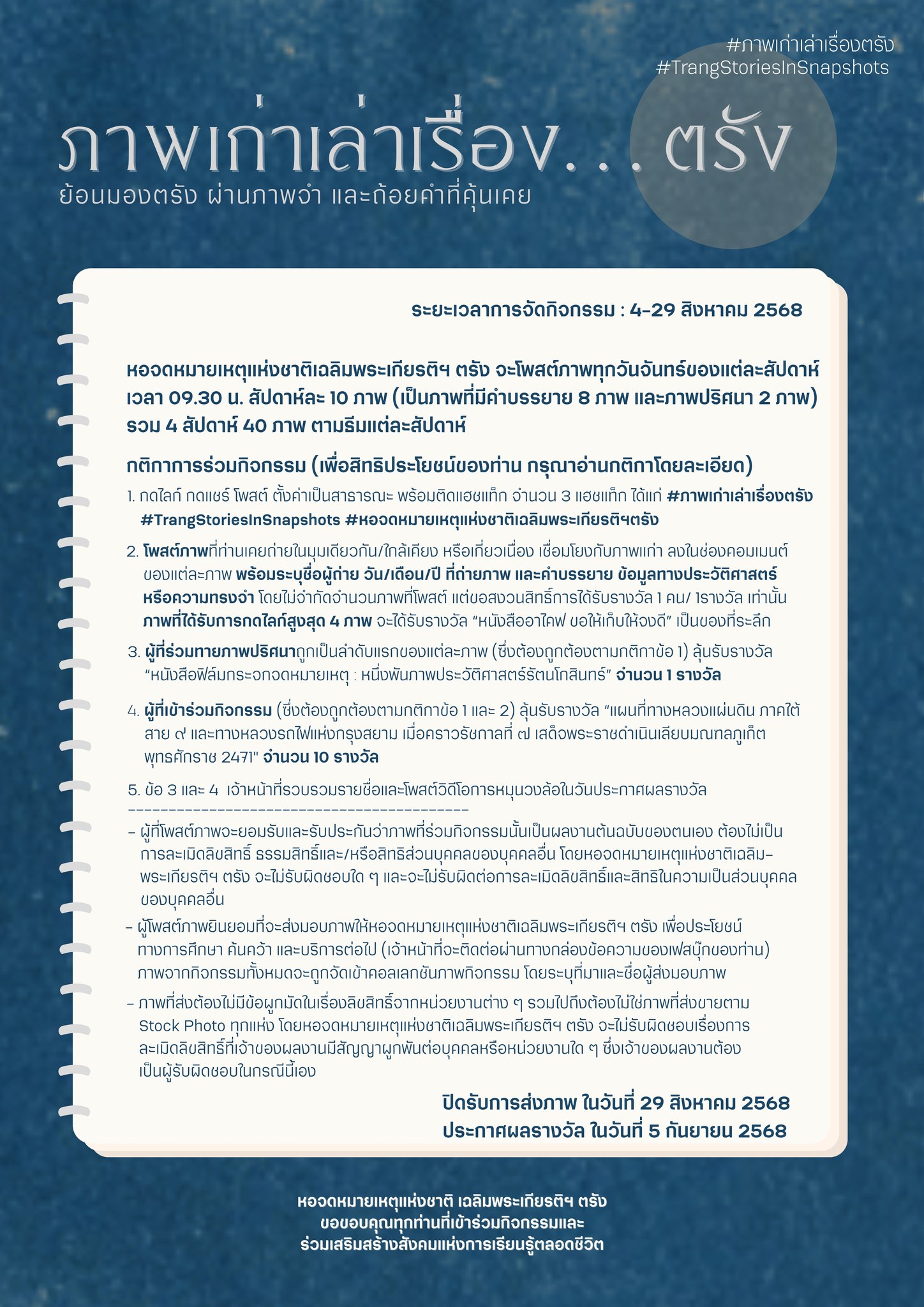 หอจดหมายเหตุแห่งชาติเฉลิมพระเกียรติฯ ตรัง ขอเชิญชวนร่วมกิจกรรม “ภาพเก่าเล่าเรื่อง...ตรัง (Trang: Stories in Snapshots)” ย้อนมองตรัง ผ่านภาพจำ และถ้อยคำที่คุ้นเคย ซึ่งจะเริ่มในสัปดาห์แรกวันที่ 4 สิงหาคม 2568 มีระยะเวลาการจัดกิจกรรม ระหว่างวันที่ 4 - 29 สิงหาคม 2568 ผู้สนใจสามารถร่วมกิจกรรมได้ทางเพจเฟซบุ๊ก 'หอจดหมายเหตุแห่งชาติเฉลิมพระเกียรติฯ ตรัง' https://www.facebook.com/trangarchive โดยทางหอจดหมายเหตุแห่งชาติเฉลิมพระเกียรติฯ ตรัง จะโพสต์ภาพทุกวันจันทร์ของแต่ละสัปดาห์ เวลา 09.30 น. สัปดาห์ละ 10 ภาพ (เป็นภาพที่มีคำบรรยาย 8 ภาพ และภาพปริศนา 2 ภาพ) รวม 4 สัปดาห์ 40 ภาพ ตามธีมแต่ละสัปดาห์ มีกติกาการร่วมกิจกรรม ดังนี้