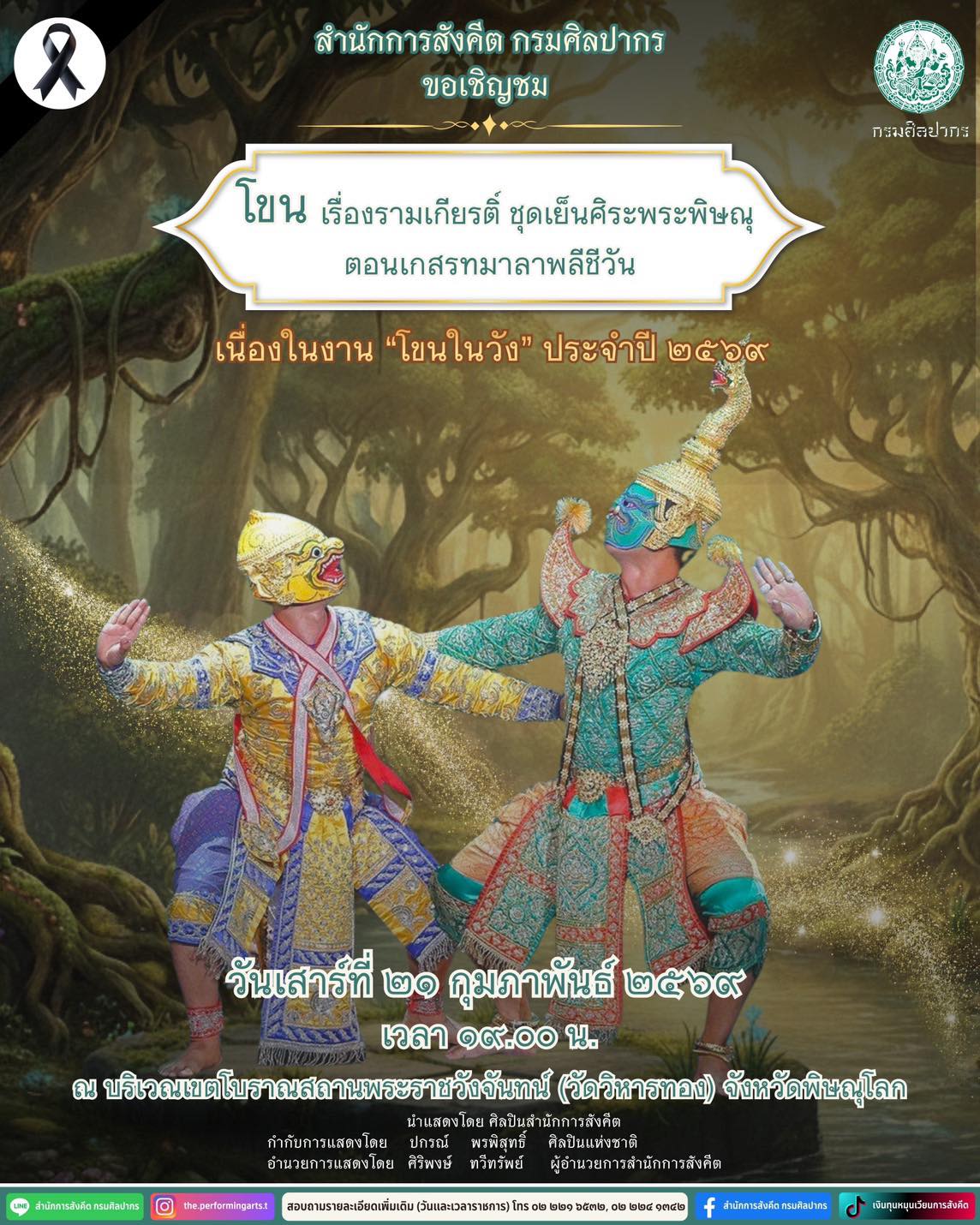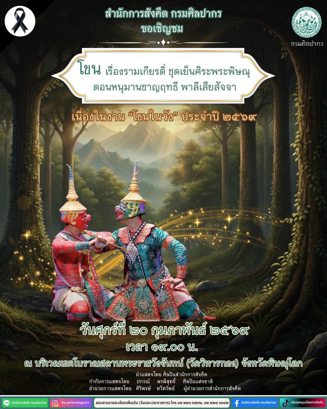 สำนักการสังคีต กรมศิลปากร ขอเชิญชมการแสดงโขน เรื่องรามเกียรติ์ ชุดเย็นศิระพระพิษณุ เนื่องในงาน ”โขนในวัง“ ประจำปี ๒๕๖๙ ระหว่างวันที่ ๒๐ - ๒๒ กุมภาพันธ์ ๒๕๖๙ เวลา ๑๙.๐๐ น. ณ บริเวณเขตโบราณสถานพระราชวังจันทน์ (วัดวิหารทอง) จังหวัดพิษณุโลก - วันศุกร์ที่ ๒๐ กุมภาพันธ์ ๒๕๖๙ โขน เรื่องรามเกียรติ์ ตอนหนุมานชาญฤทธี พาลีเสียสัจจา