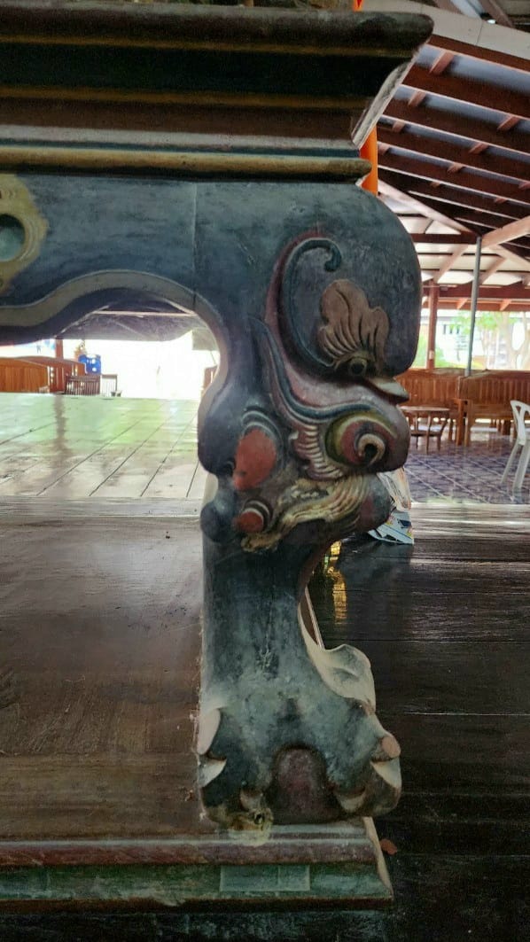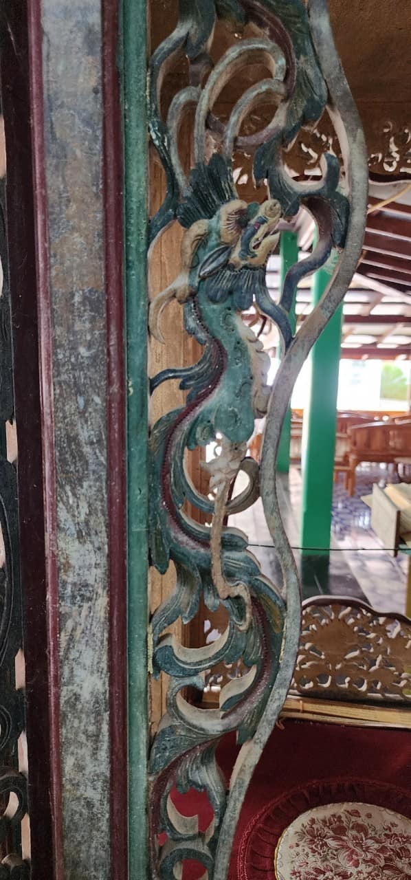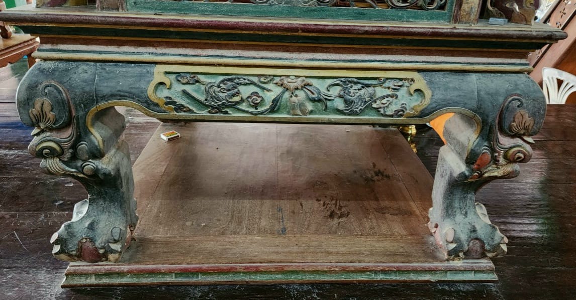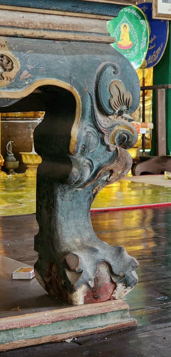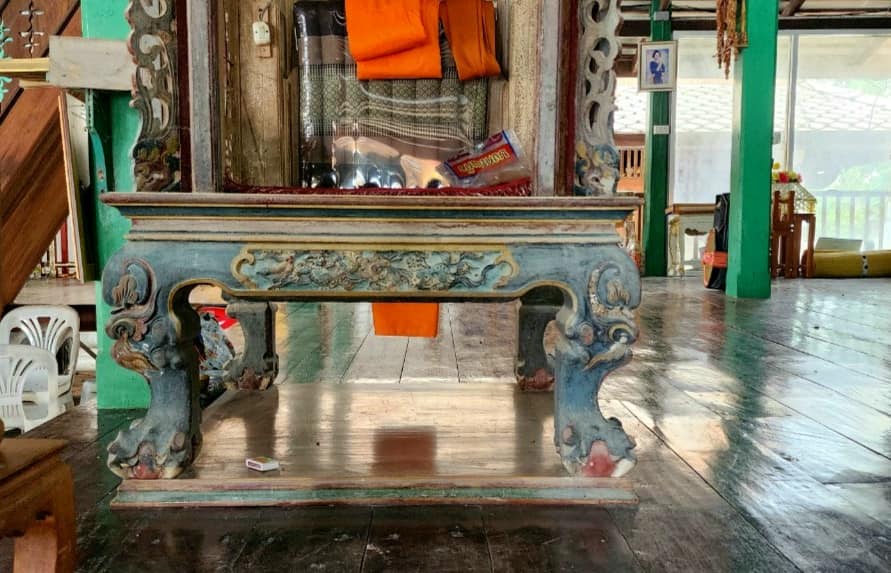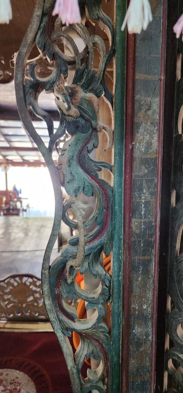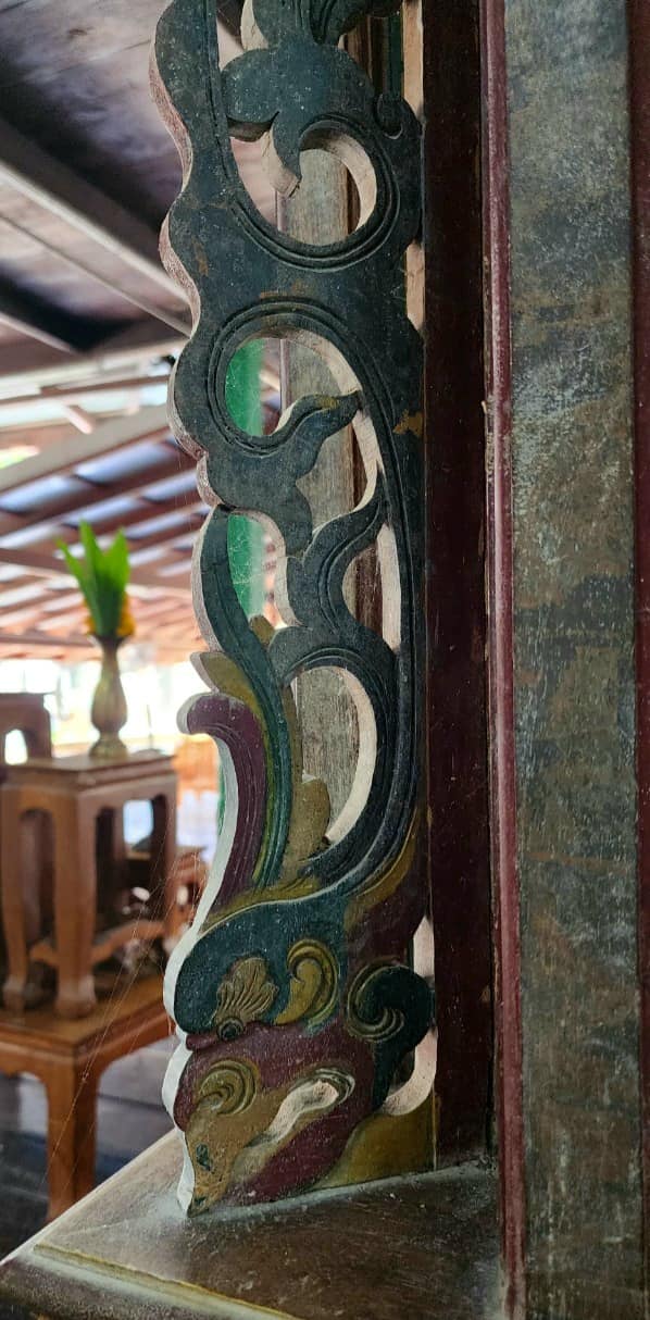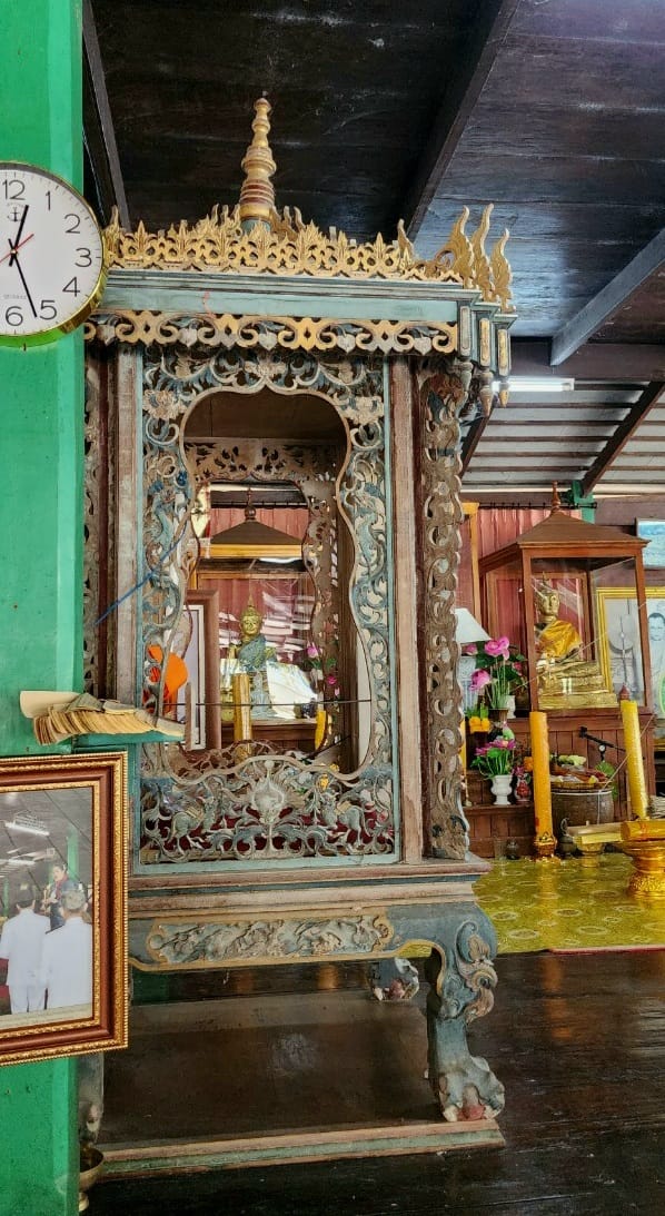 ธรรมาสน์บุษบกยอดปราสาท จำหลักไม้เขียนสีเป็นลวดลายพรรณพฤกษาและสัตว์มงคลจีน ศิลปกรรมร่วมไทย-จีน ภายในหอสวดมนต์ วัดสำเร็จ ต.มะเร็ต อ.เกาะสมุย จ.สุราษฎ์ธานี