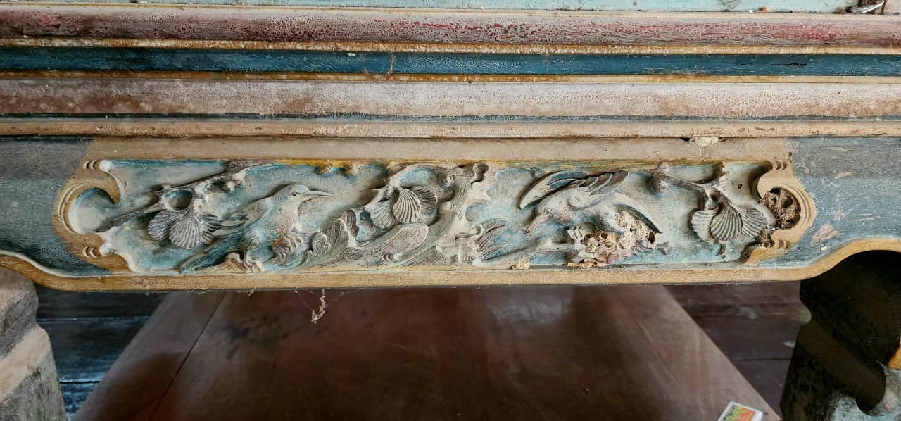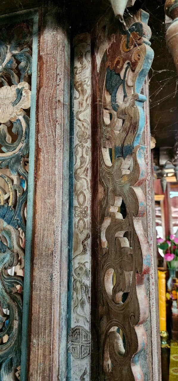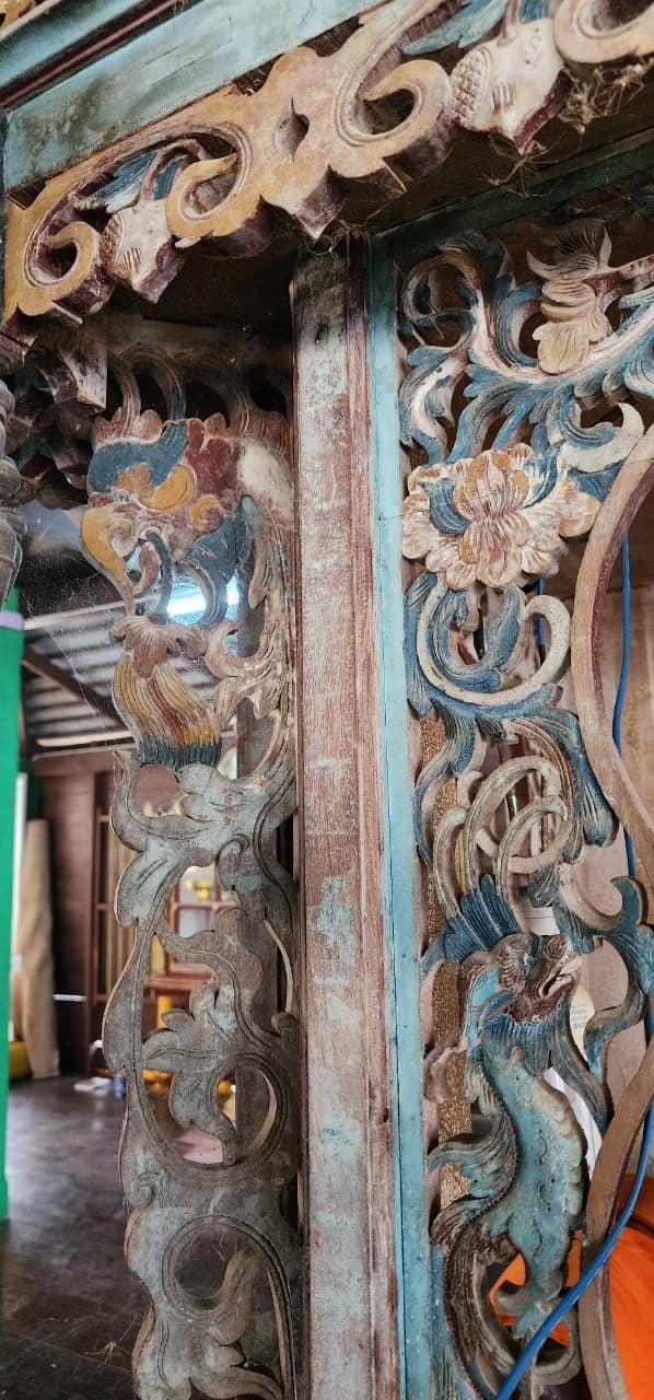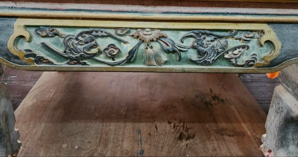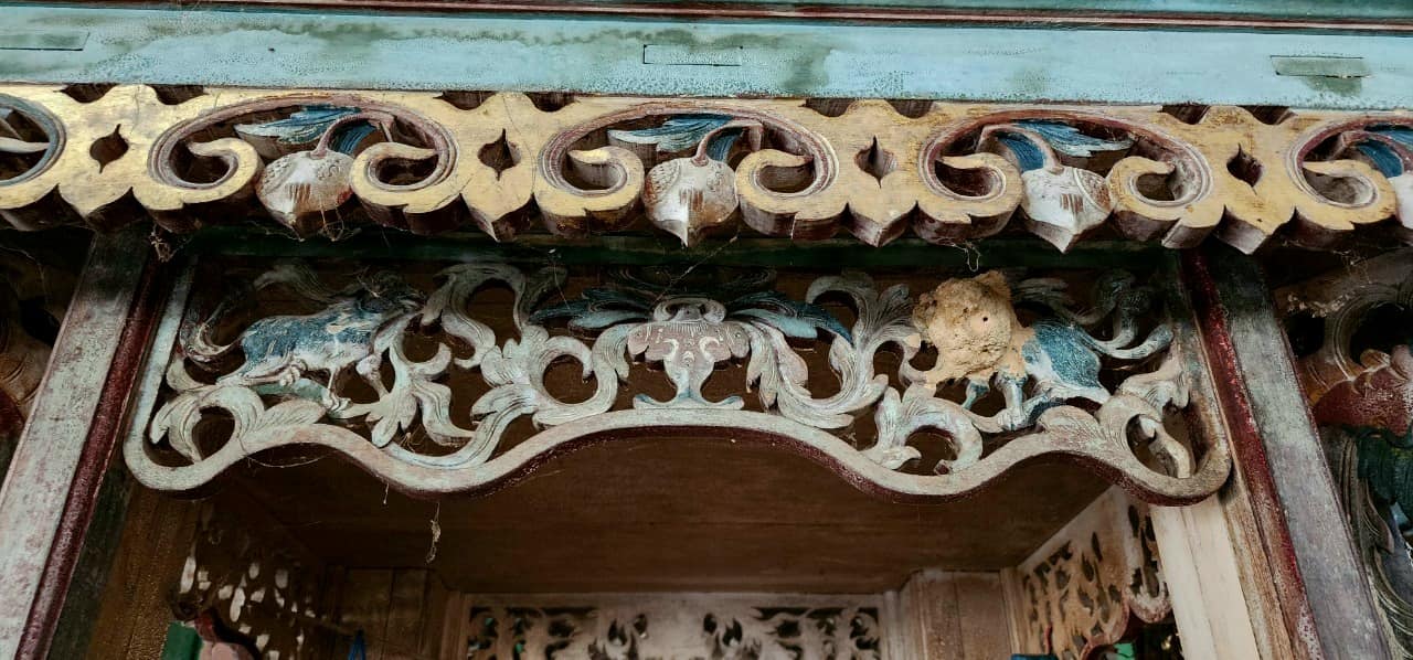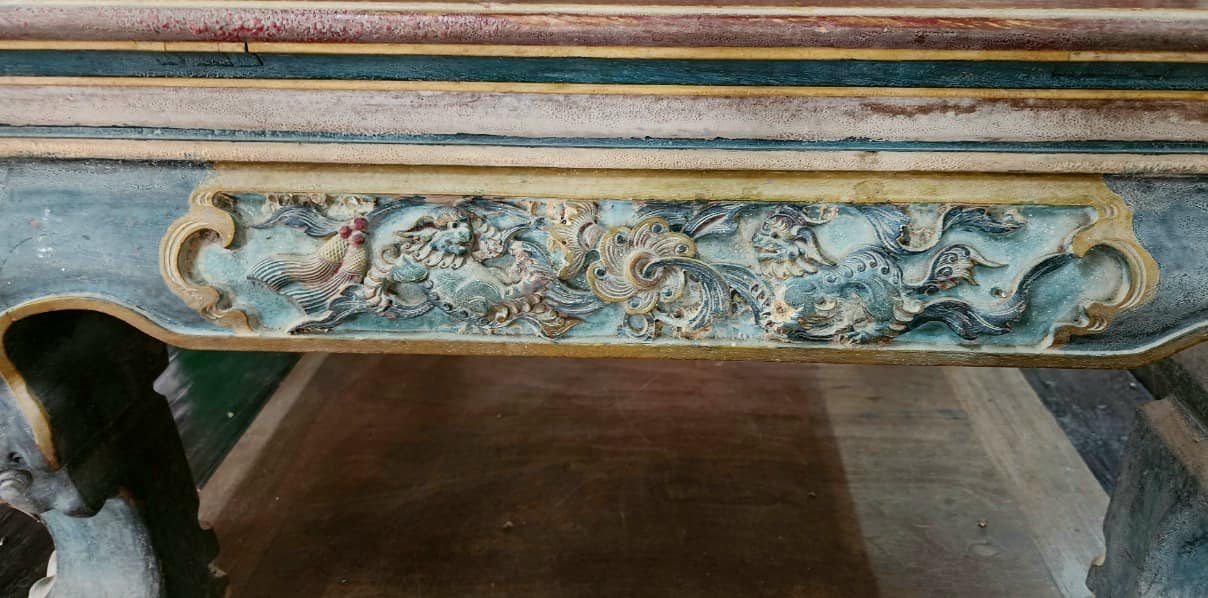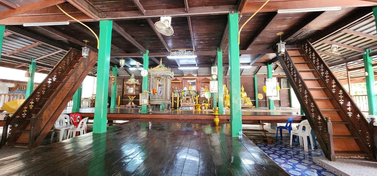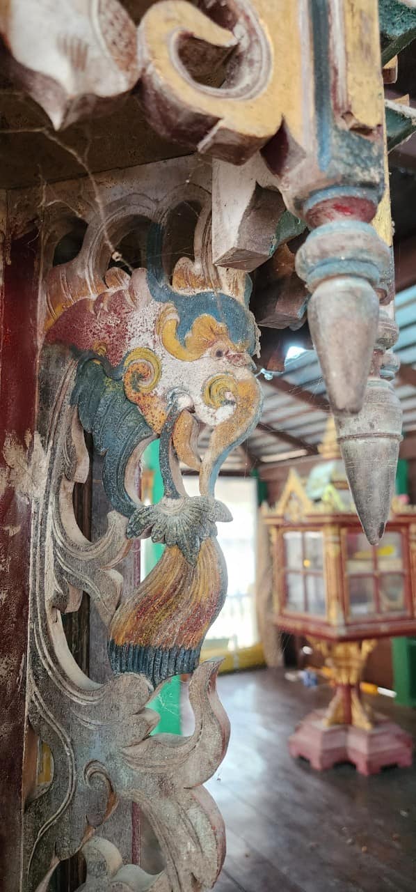 ธรรมาสน์บุษบกยอดปราสาท จำหลักไม้เขียนสีเป็นลวดลายพรรณพฤกษาและสัตว์มงคลจีน ศิลปกรรมร่วมไทย-จีน ภายในหอสวดมนต์ วัดสำเร็จ ต.มะเร็ต อ.เกาะสมุย จ.สุราษฎ์ธานี