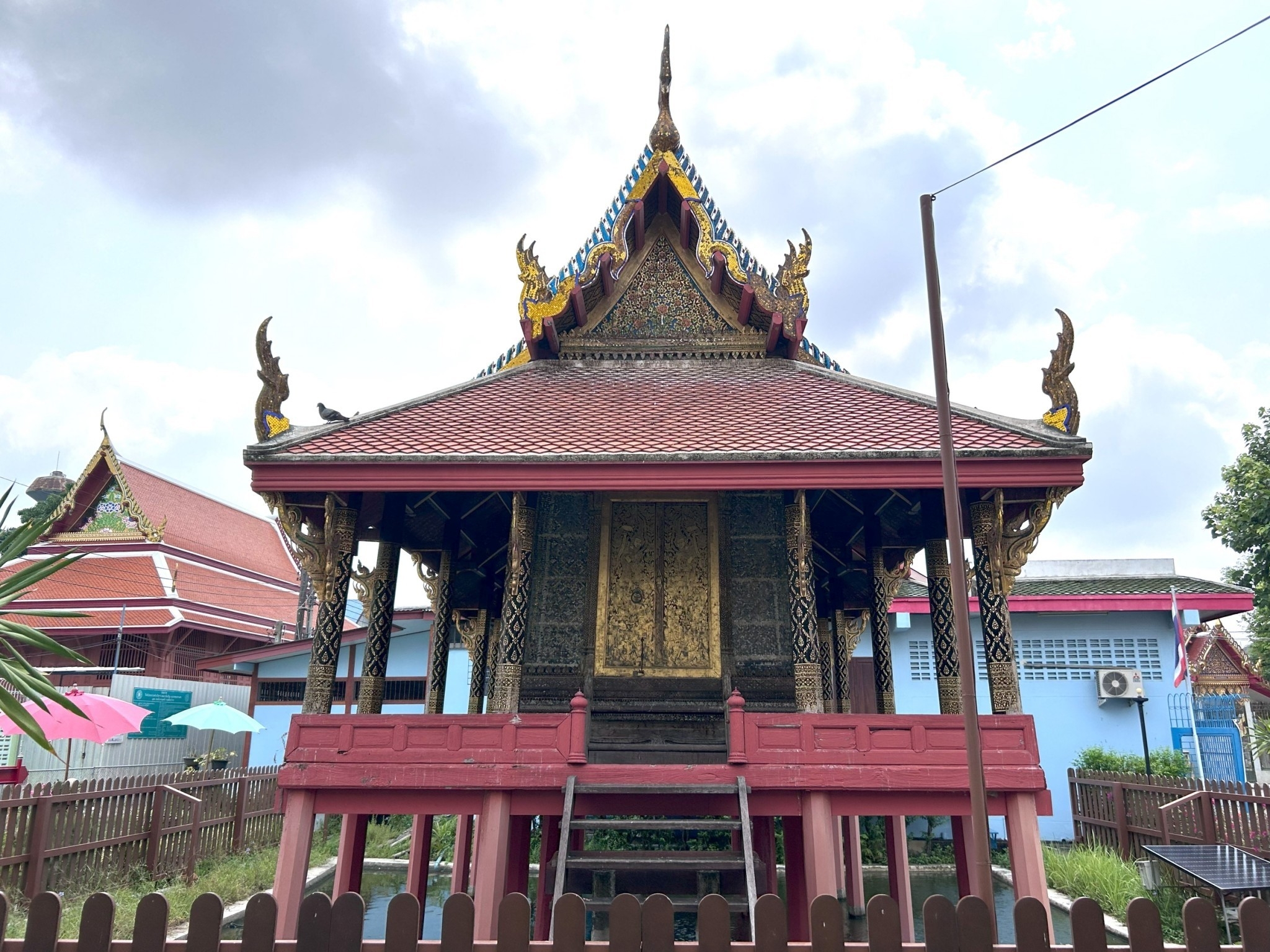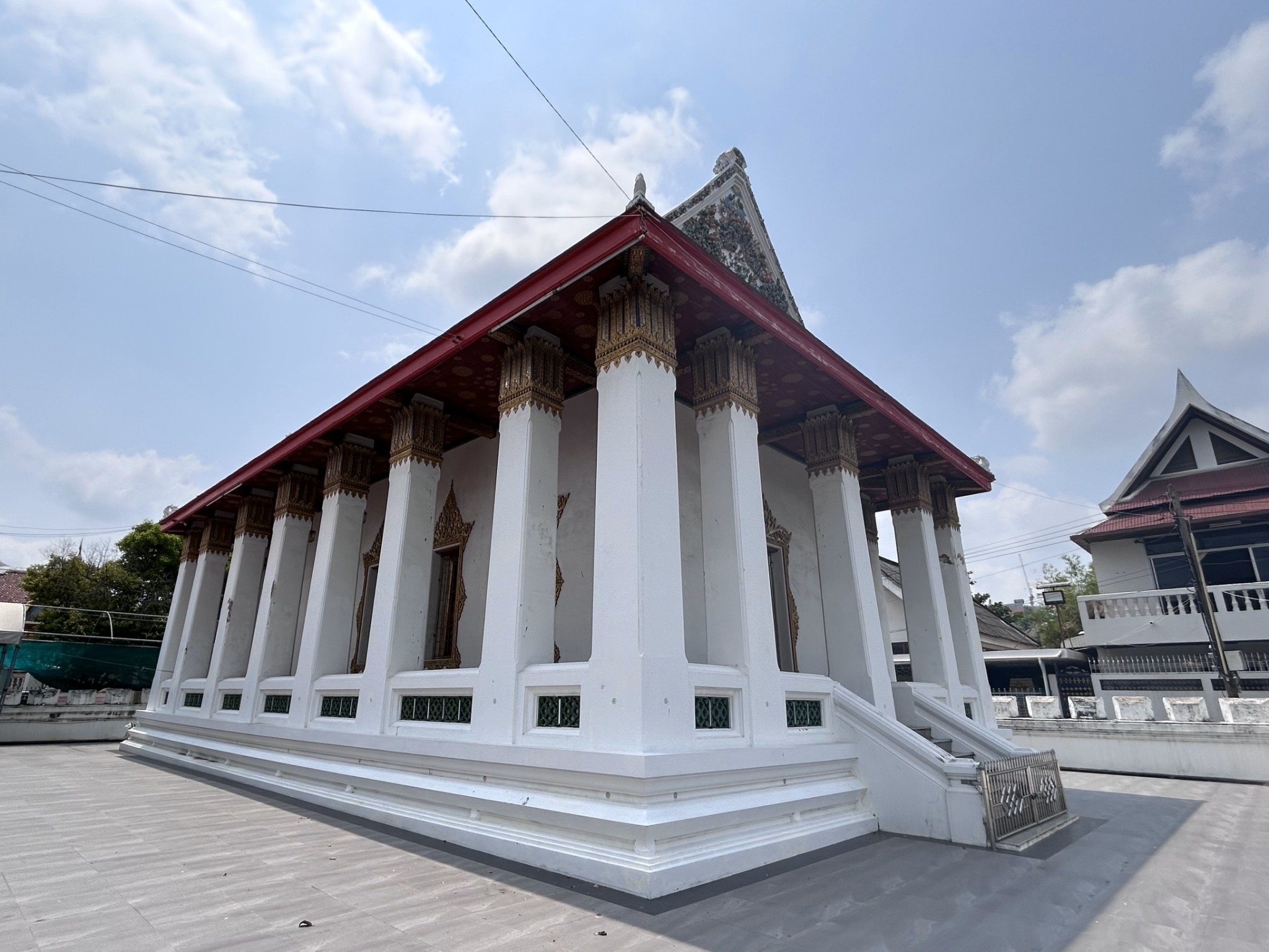หอพระไตรปิฎก สันนิษฐานว่าหอพระไตรปิฎกนี้ได้รับการสถาปนาขึ้นในสมัยรัชกาลที่ ๓ สร้างอยู่กลางสระน้ำตามแบบอย่างของหอไตรในสมัยโบราณ และน่าจะเหลืออยู่เพียงแห่งเดียวในกรุงรัตนโกสินทร์ที่ยังรักษารูปแบบไว้ได้เป็นอย่างดี จัดเป็นอาคารแบบไทยประเพณี หลังคาทรงจั่วลดชั้นหน้าบัน เรือนของหอไตรมีระเบียงกั้นพนักล้อมทั้งสี่ด้านมีเฉลียงรอบ และมีหลังคาพาไลคลุมโดยรอบ ส่วนของผนังเรือนด้านหน้ามีประตูทางเข้าที่มีซุ้มประตูทรงบรรพแถลง ผนังด้านข้างเป็นหน้าต่าง ๒ ช่อง ประดับซุ้มทรงปราสาหยอด ซึ่งซุ้มหน้าต่างทรงปราสาทยอดประดับตกแต่งด้วยเครื่องไม้กึ่งลอยตัววิจิตรงดงามอย่างมาก งานประดับตกแต่งที่สำคัญที่ได้รับการยกย่องคือ การประดับกระจกเกรียบหลากสีเต็มพื้นที่ฝาผนังและเสาระเบียง เป็นลายดอกไม้สี่กลีบในกรอบสี่เหลี่ยมขนมเปียกปูน เป็นหอไตรอย่างไทยประเพณีที่มีความงามเป็นเอกลักษณ์หาได้ยาก และน่าจะเหลือเพียงหลังเดียวในกรุงรัตนโกสินทร์ สำหรับภายในมีงานจิตรกรรมฝาผนังเขียนที่คอสองเป็นเรื่องทศชาติ