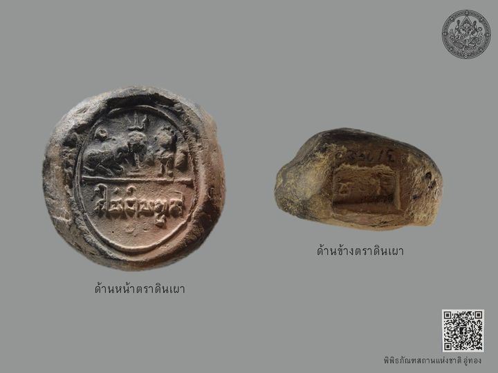 ตราดินเผารูปสัญลักษณ์ทางศาสนาประกอบอักษรโบราณ พบที่เมืองโบราณอู่ทอง อำเภออู่ทอง จังหวัดสุพรรณบุรี จัดแสดง ณ ห้องบรรพชนคนอู่ทอง พิพิธภัณฑสถานแห่งชาติ อู่ทอง