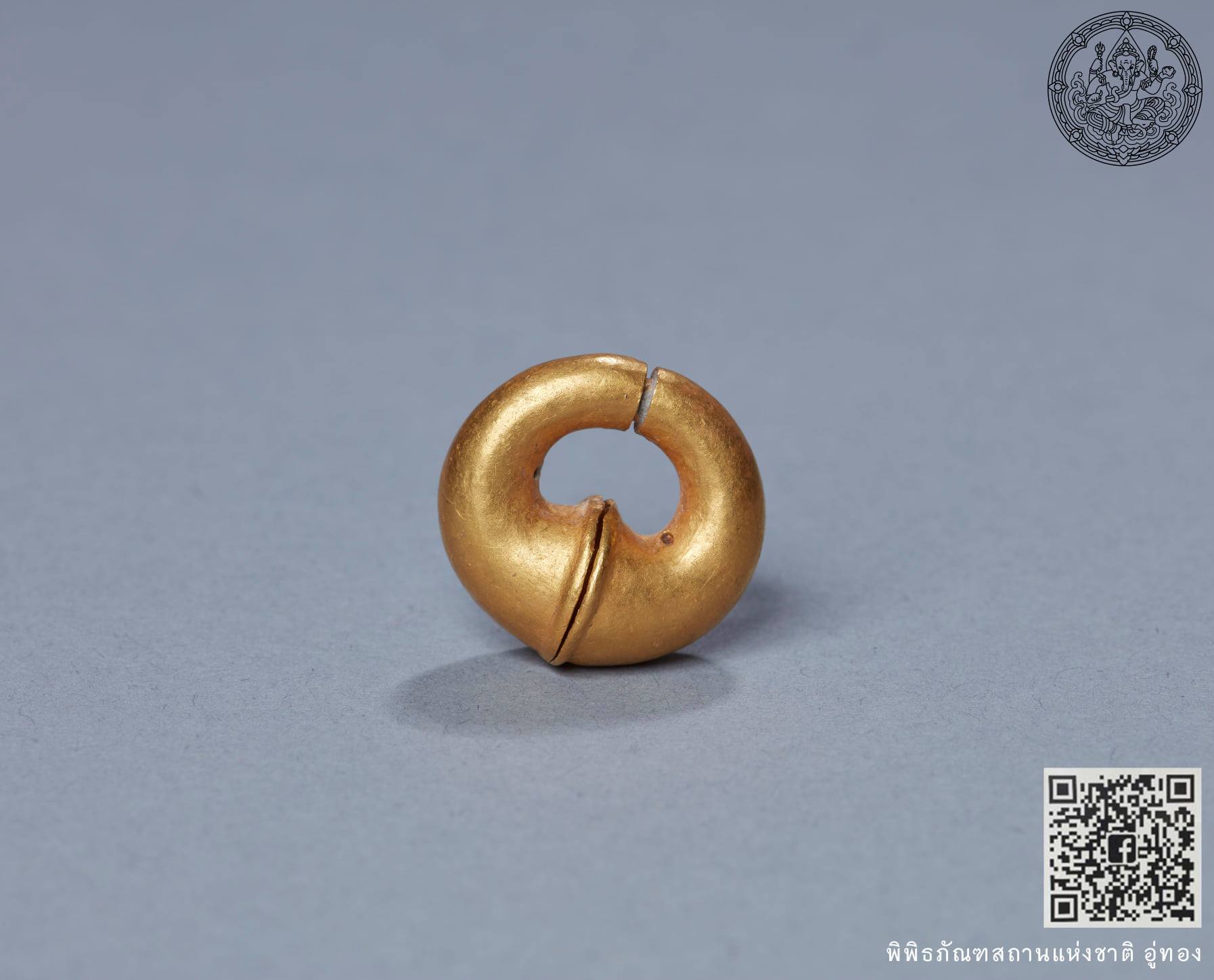 ตุ้มหูทองคำ นายเนรมิต อ่ำพุทรา เจ้าหน้าที่ของพิพิธภัณฑสถานแห่งชาติ อู่ทอง พบบริเวณริมสระน้ำภายในพิพิธภัณฑสถานแห่งชาติ อู่ทอง จังหวัดสุพรรณบุรี เมื่อวันที่ ๙ มิถุนายน ๒๕๕๓ จัดแสดงห้องบรรพชนคนอู่ทอง พิพิธภัณฑสถานแห่งชาติ อู่ทอง