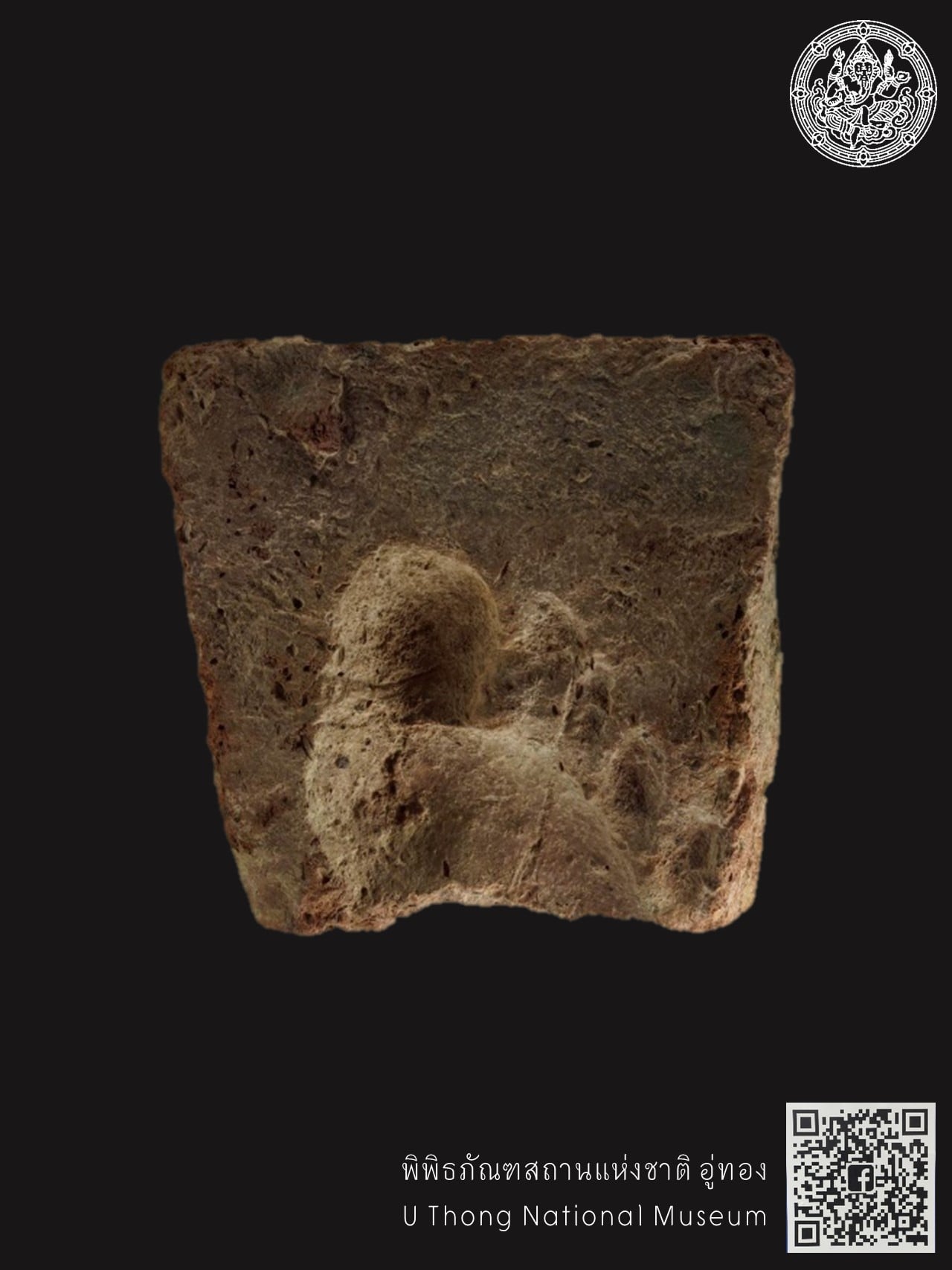 แผ่นอิฐทรงสี่เหลี่ยมผืนผ้า ชำรุดหักหายไปส่วนหนึ่ง ขนาดกว้าง ๑๘.๕ เซนติเมตร ยาว ๑๙.๕ เซนติเมตร หนา ๗.๕ เซนติเมตร เนื้ออิฐมีรูพรุน เห็นร่องรอยแกลบข้าวในเนื้ออิฐอย่างชัดเจน บนผิวหน้าอิฐมีรอยประทับรูปฝ่าเท้าด้านขวา ซึ่งสันนิษฐานว่าอาจเกิดขึ้นจากความบังเอิญในระหว่างขั้นตอนการผลิตอิฐที่ใช้ในการก่อสร้างงานสถาปัตยกรรม กำหนดอายุสมัยทวารวดี ราวพุทธศตวรรษที่ ๑๒ – ๑๖ หรือประมาณ ๑,๐๐๐ – ๑,๔๐๐ ปีมาแล้ว
