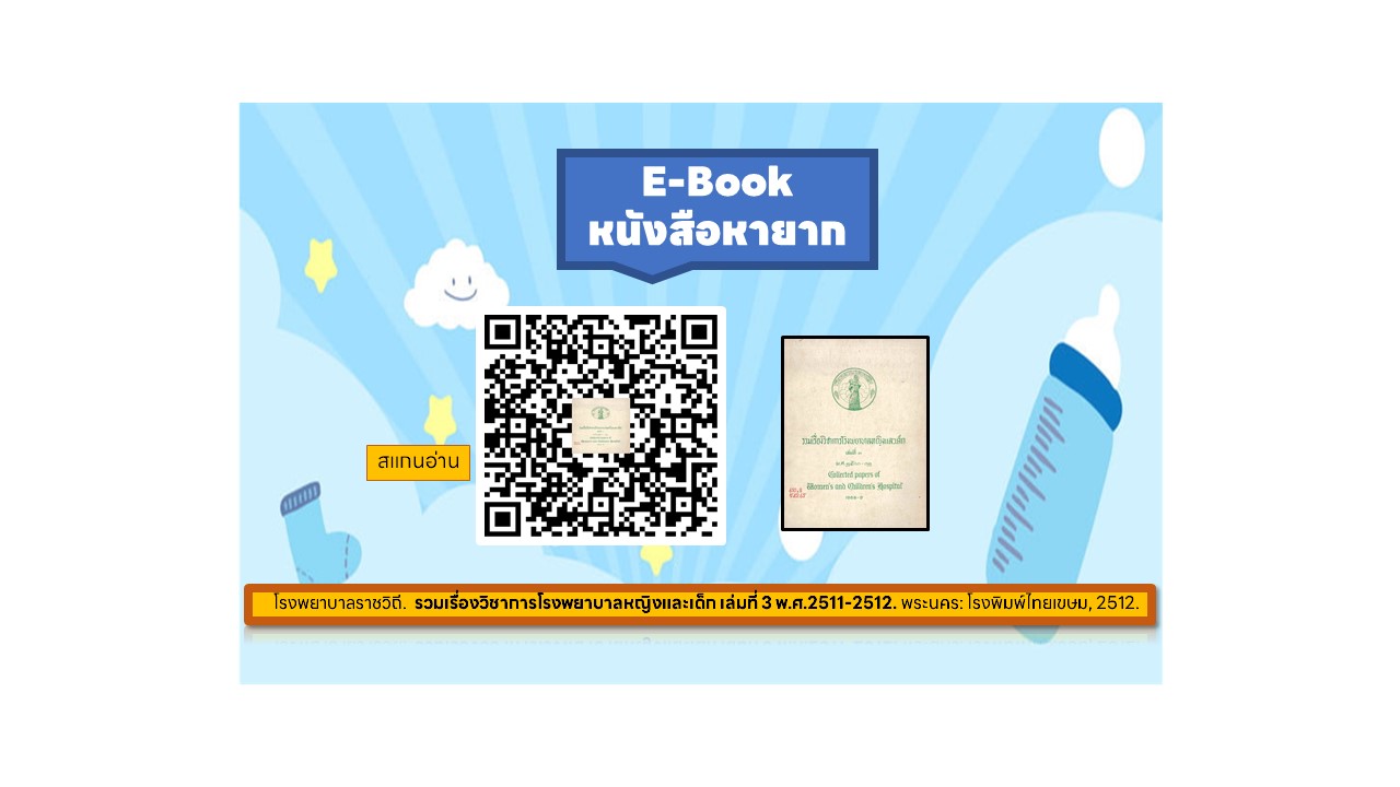 โรงพยาบาลราชวิถี. รวมเรื่องวิชาการโรงพยาบาลหญิงและเด็ก เล่มที่ 3 พ.ศ. 2511 - 2512. พระนคร: โรงพิมพ์ไทยเขษม, 2512.