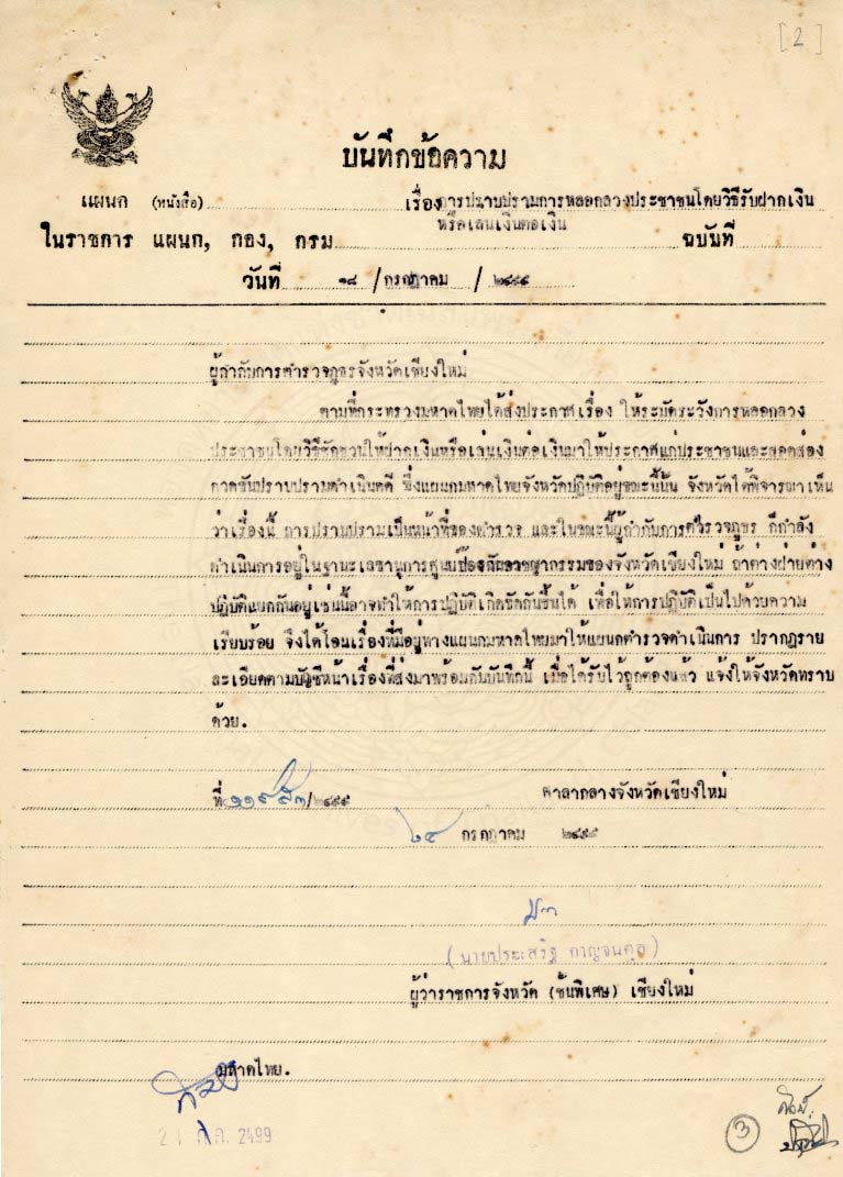 อย่างไรก็ตาม หากย้อนกลับไปครั้งอดีตเมื่อปีพุทธศักราช ๒๔๙๙ ถึง ๒๕๐๑ มีเหตุการณ์การหลอกลวงประชาชนรูปแบบหนึ่ง คือ การชักชวนให้ฝากเงิน ดังปรากฏในเอกสารจดหมายเหตุ ชุดสำนักงานปกครองจังหวัดเชียงใหม่ เรื่อง การใช้กลอุบายหลอกหลวงประชาชน