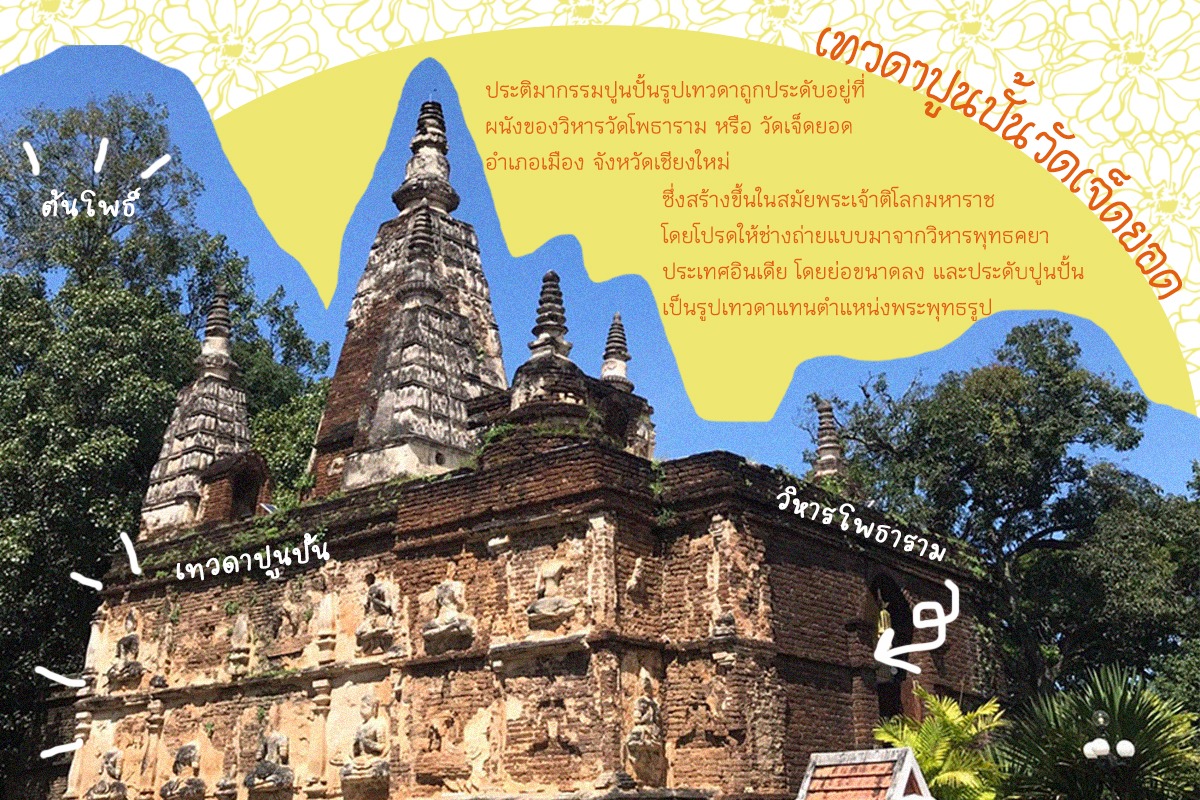 ประติมากรรมปูนปั้นรูปเทวดาถูกประดับอยู่ที่บริเวณผนังของวิหารวัดมหาโพธาราม หรือ วัดเจ็ดยอด อำเภอเมือง จังหวัดเชียงใหม่ ซึ่งสร้างขึ้นใน พ.ศ. 1998 สมัยพระเจ้าติโลกมหาราช โดยโปรดให้ช่างถ่ายแบบมาจากวิหารมหาโพธิ์ ตำบลพุทธคยา ประเทศอินเดีย โดยย่อส่วนให้เหลือประมาณ 1 ใน 3 ส่วนเท่านั้น ส่วนลวดลายปูนปั้นที่ผนังนอกวิหารใช้การประดับเป็นรูปเทวดาแทนตำแหน่งพระพุทธรูป ซึ่งแตกต่างจากต้นแบบ