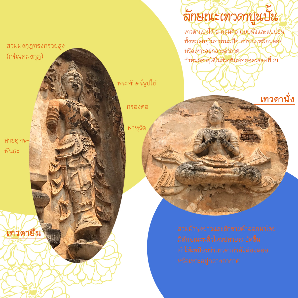 1. เทวดานั่งพนมมือ ท่าทางเหมือนลอยหรือเหาะอยู่กลางอากาศ ประดับที่ผนังด้านทิศเหนือและทิศใต้