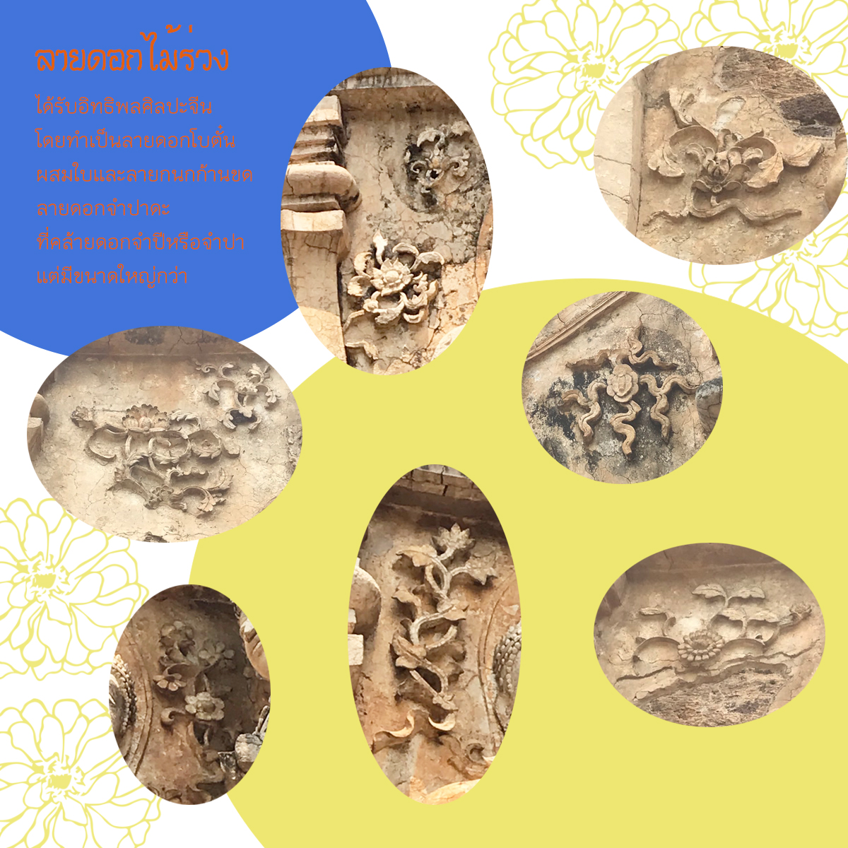 พื้นหลังมีลายดอกไม้ร่วง โดยทำเป็นลายดอกโบตั๋น ผสมใบและลายกนกก้านขด ลายก้อนเมฆ ลายจำปาดะที่คล้ายดอกจำปีหรือจำปา แต่มีขนาดใหญ่กว่า