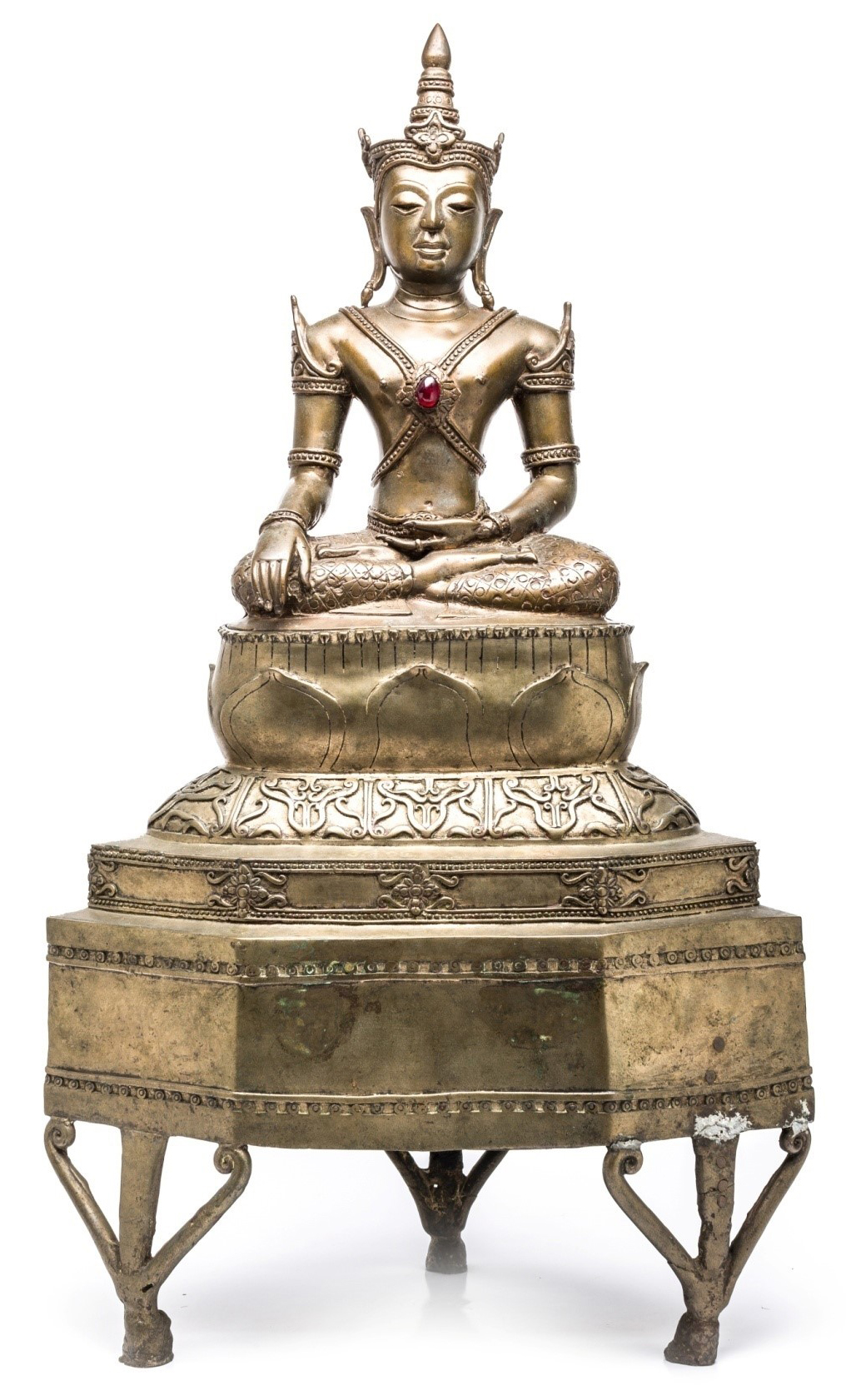 พระพุทธรูปทรงเครื่อง พระพักตร์ค่อนข้างกลม พระขนงโก่งต่อกันเป็นปีกกา พระเนตรเซาะร่องลึก พระนาสิกโด่ง พระหนุเป็นปม พระอังสากว้าง พระวรกายเพรียวบาง ทรงมงกุฎ กุณฑล สังวาล พาหุรัด ทองพระกรและพระธำมรงค์ ทับทรวงประดับพลอยสีแดง มีการตกแต่งจีวรด้วยลายลูกประคำ ประทับนั่งขัดสมาธิเพชร บนฐาน ๒ ชั้น โดยฐานตอนบนเป็นฐานปัทม์มีเกสร ตกแต่งส่วนบัวคว่ำด้วยลวดลายที่ได้รับแรงบันดาลใจจากศิลปะจีน ตอนล่างเป็นฐานหน้ากระดานหกเหลี่ยม ฐานล่างสุดมีขา หรือส่วนของสายชนวนสำหรับเททอง ๓ ด้าน