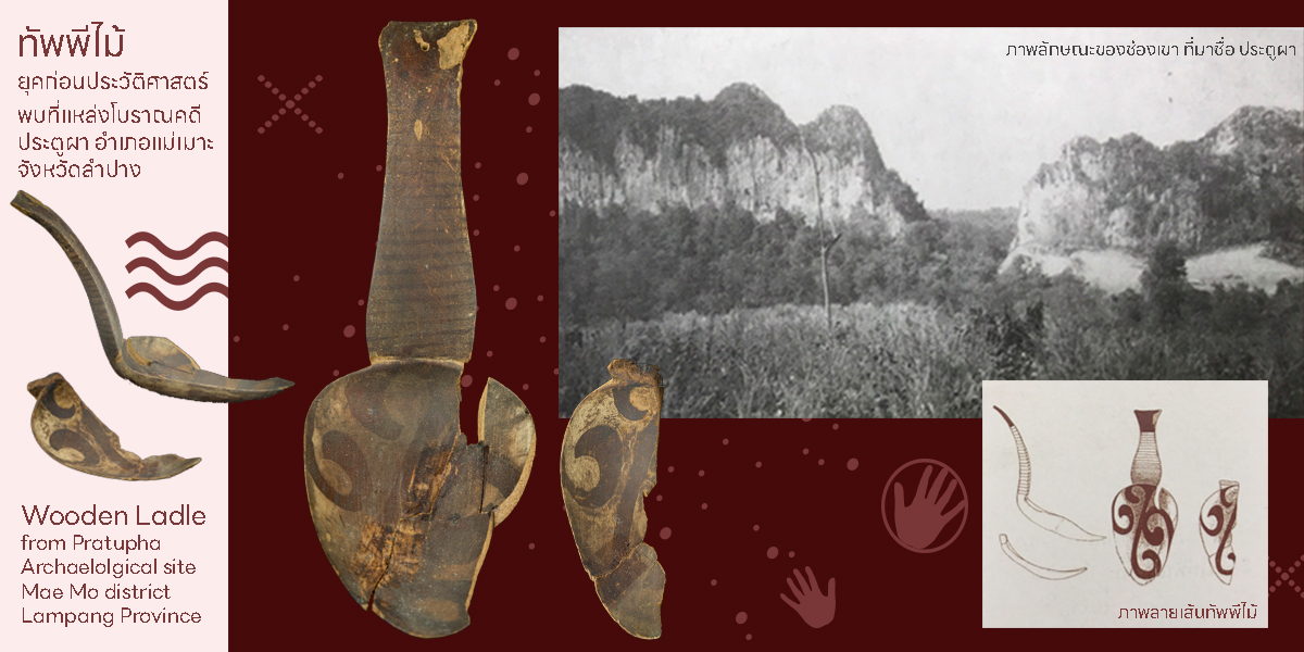 ทัพพีไม้เขียนสีทำด้วยไม้ชิ้นเดียวที่มีการถากและขูดเอาเนื้อไม้ออกจนได้รูปร่างที่ต้องการ สันนิษฐานว่าคงทำขึ้นเพื่อเป็นของอุทิศให้แก่ผู้ตาย เนื่องจากมีการเขียนลายสีแดงตกแต่งทั้งชิ้นเพิ่มความสวยงาม สะท้อนให้เห็นถึงงานฝีมือและความคิดสร้างสรรค์ของคนในอดีต ที่ไม่เพียงรู้จักการผสมสีจากหินสีหรือดินเทศเพื่อใช้เขียนภาพบนผนังเพียงอย่างเดียว แต่ยังนำมาเขียนภาพลงบนสิ่งของเครื่องใช้ด้วย และอาจเป็นไปได้ว่าเป็นคนกลุ่มเดียวกันเป็นผู้วาดก็เป็นได้