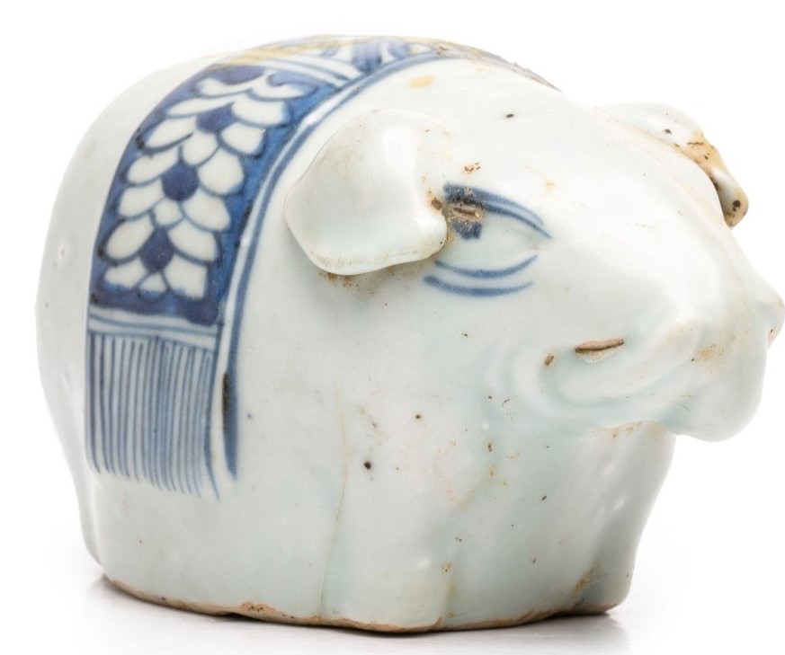 เครื่องลายครามรูปช้าง บนหลังเขียนลายครามเป็นผ้าคลุม