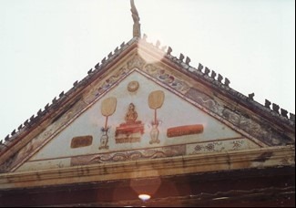 หน้าบันด้านหน้าประดับปูนปั้นทาสีรูปพระพุทธรูปประทับนั่ง