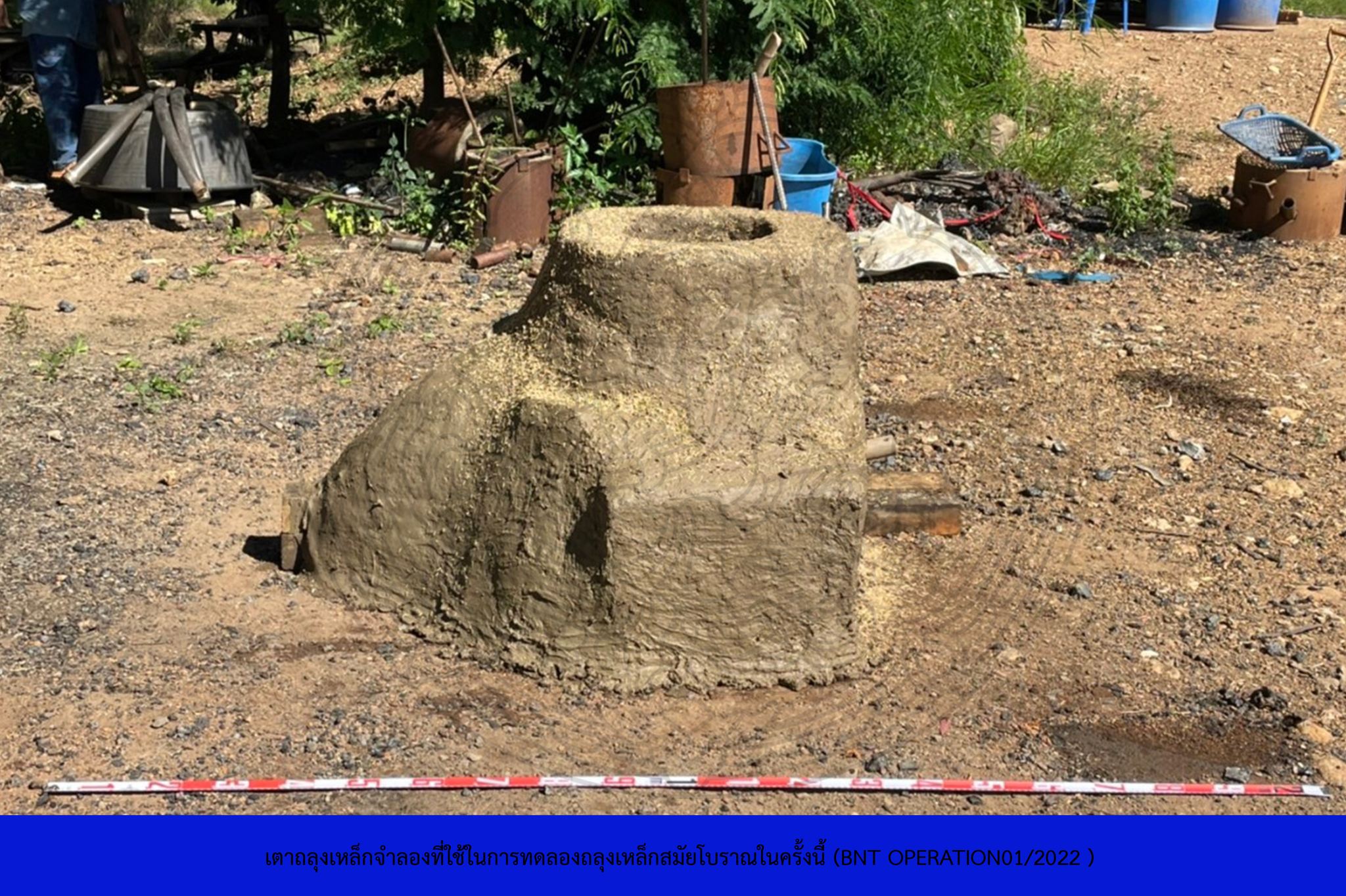 ในบทความนี้ ผู้เขียนจะนำเสนอผลการทดลองถลุงเหล็กสมัยโบราณตามกระบวนทัศน์ดังกล่าวข้างต้น โดยเป็นการจำลองเตาถลุงเหล็กที่ขุดค้นพบในแหล่งโบราณคดีบ้านนาตุ้ม จังหวัดแพร่ ซึ่งเป็นแหล่งถลุงเหล็กสมัยโบราณแบบทางตรง (Direct Process) แห่งสุดท้ายของดินแดนล้านนา อายุราวพุทธศตวรรษที่ 23 – 25 (ประมาณ 100 – 200 ปีมาแล้ว) ซึ่งถือเป็นการทดลองถลุงเหล็กสมัยโบราณแบบทางตรงที่ใช้แร่เหล็กฮีมาไทต์ (Hematite/แร่เหล็กสีเลือดนก) ซึ่งเป็นแร่เหล็กที่ไม่เหนี่ยวนำแม่เหล็กเป็นครั้งแรกของกรมศิลปากร โดยเป็นแร่เหล็กที่ใช้ในการทดลองถลุงเป็นแร่เหล็กชนิดและเหมืองแร่เหล็กเดียวกัน (เหมืองแร่เหล็กดอยเหล็ก)กับที่ขุดค้นพบในแหล่งโบราณคดีบ้านนาตุ้มและยังกำหนดตัวแปรควบคุมต่างๆ ในการทดลองให้ใกล้เคียงกับหลักฐานทางโบราณคดีมากที่สุด เช่น เชื้อเพลิง ปริมาณแร่ วัสดุที่ก่อสร้างเตา รูปแบบโครงสร้างเตา เป็นต้น โดยการจำลองเตาจะใช้ขนาดและรูปแบบเดียวกันกับที่ขุดค้นพบในแหล่งโบราณคดีฯ จากการรวบรวมข้อมูลลักษณะทางกายภาพของโครงสร้างเตาถลุงเหล็กจากผลการดำเนินงานทางโบราณคดีของกรมศิลปากรในปี พ.ศ.2561 พ.ศ.2562 และ พ.ศ.2565 พบว่าเตาถลุงเหล็กทั้งหมดที่ขุดค้นพบก่อด้วยดินและมีขนาดเกือบจะเท่ากันทุกเตา เมื่อคำนวณค่าเฉลี่ยแล้วเตาถลุงเหล็กของแหล่งโบราณคดีบ้านนาตุ้มมีลักษณะเป็นรูปทรงวงรี มีความกว้างเฉลี่ยประมาณ 29.75 เซนติเมตร (หรือ 30 เซนติเมตร) ยาวไม่ต่ำกว่า 1 เมตร ผนังมีความหนาประมาณ 10-15 เซนติเมตร มีความสูงไม่ต่ำกว่า 70 เซนติเมตร สัณฐานของเตาถลุงเมื่อมองจากมุมบนจะมีลักษณะเป็นรูปวงรี โครงสร้างแต่ละเตาก่อด้วยดินเผาเรียงตัวในแนวเดียวกัน (ทิศเหนือ – ใต้) มีการเสริมความมั่นคงให้กับผนังเตาแต่ละเตาด้วยการเติมช่องว่างระหว่างเตาที่มีระยะห่างประมาณ 0.5 – 1 เมตร ด้วยการก่อแนวอิฐ แนวหิน หรือใช้ก้อนตะกรันผสมดินเหนียวก่อเติมเต็มช่องว่างระหว่างเตาเพื่อเพิ่มความแข็งแรงให้ผนังเตาทุกเตา สันนิษฐานว่าเตามีลักษณะเป็นทรงสูง (Sharf Furnace) ที่มีส่วนยื่นยาวออกมาทางด้านหน้าเตาเป็นทางระบายตะกรัน พื้นเตามีลักษณะลาดเอียงประมาณ 25 องศา ปล่องเตามีความกว้างไม่ต่ำกว่า 30 เซนติเมตร ที่ปลายก้นเตาด้านตะวันออกของเตามีการเจาะช่องวงกลมขนาดเส้นผ่าศูนย์กลาง 13 – 15 เซนติเมตร สำหรับเป็นที่ใส่ช่องปลายหุ้มท่อลมดินเผา ปลายปากเตาด้านหน้าเป็นช่องระบายตะกรันออกมีขนาดกว้างประมาณ 10 เซนติเมตร จากการขุดค้นทางโบราณคดีพบว่ามีการใช้ก้อนอิฐอุดปากเตาในขณะที่ทำการถลุง โดยพบก้อนอิฐบริเวณด้านหน้าเตาจำนวนหนึ่ง