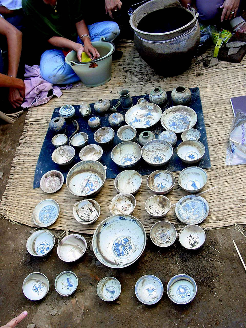 .. 2) ความสัมพันธ์ระหว่างจีนกับล้านนา การศึกษาทางโบราณคดี พบหลักฐานประจักษ์พยานสำคัญ คือ กลุ่มภาชนะเครื่องถ้วยจีนและเครื่อใช้อื่น ๆ รวมกว่า 50 รายการ บรรจุในใหและถูกนำมาฝังอยู่ในชั้นดินก่อนการล่มสลายของเวียงกุมกาม หนึ่งในหลักฐานกลุ่มนี้ปรากฏเครื่องถ้วยจีนสมัยราชวงศ์หมิง ที่ปรากฏจารึกอักษรจีน บ่งชี้ให้เห็นว่า เป็นของที่ผลิตขึ้นจากเตาหลวง สำหรับเป็นเป็นเครื่องต้นสำหรับจักรพรรดิ หรือพระราชทานให้แก่พระมหากษัตริย์ของดินแดนที่มีความสัมพันธ์ทางการทูต และได้รับการยอมรับในพระราชอำนาจจากจักรพรรดิจีนเท่านั้น หลักฐานกลุ่มนี้จึงแสดงให้เห็นถึงความสัมพันธ์ระหว่างจีนและล้านนาผ่านระบบบรรณาการได้เป็นอย่างดี