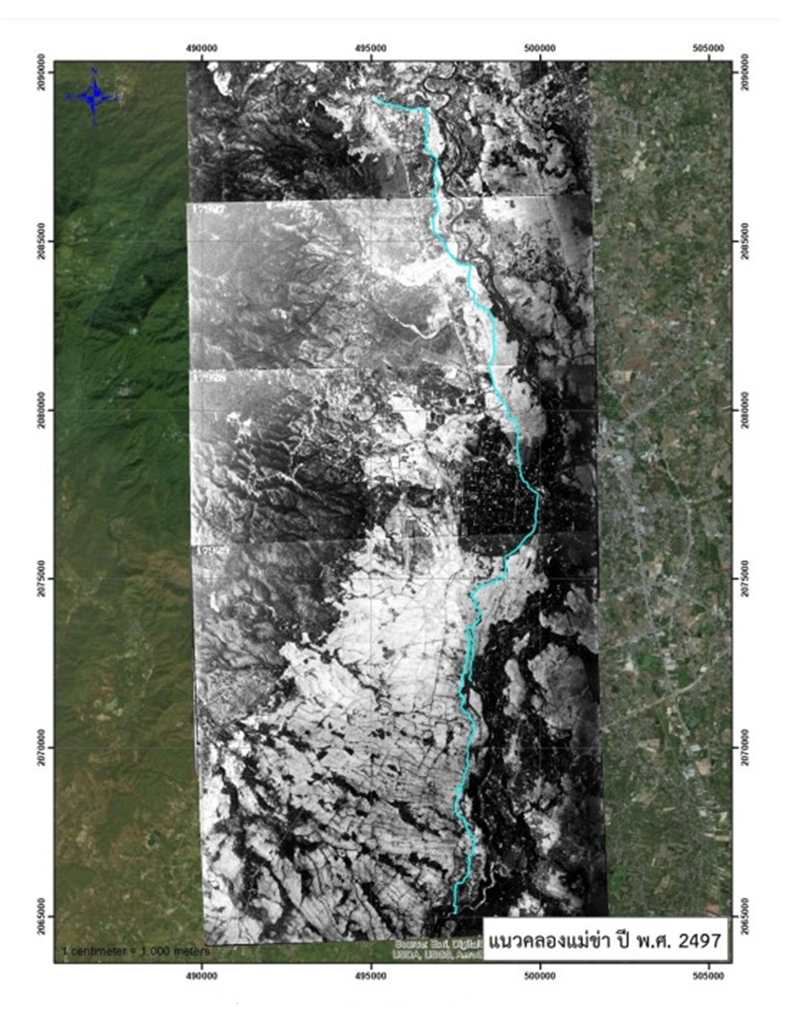 ทั้งนี้หลักฐานที่ช่วยคลี่ให้เห็นพัฒนาการของลำน้ำแม่ข่านี้ชัดเจนขึ้น คือ แผนที่ผังเมืองเชียงใหม่ และภาพถ่ายทางอากาศเมืองเชียงใหม่ ที่ถ่ายใน พ.ศ.2497