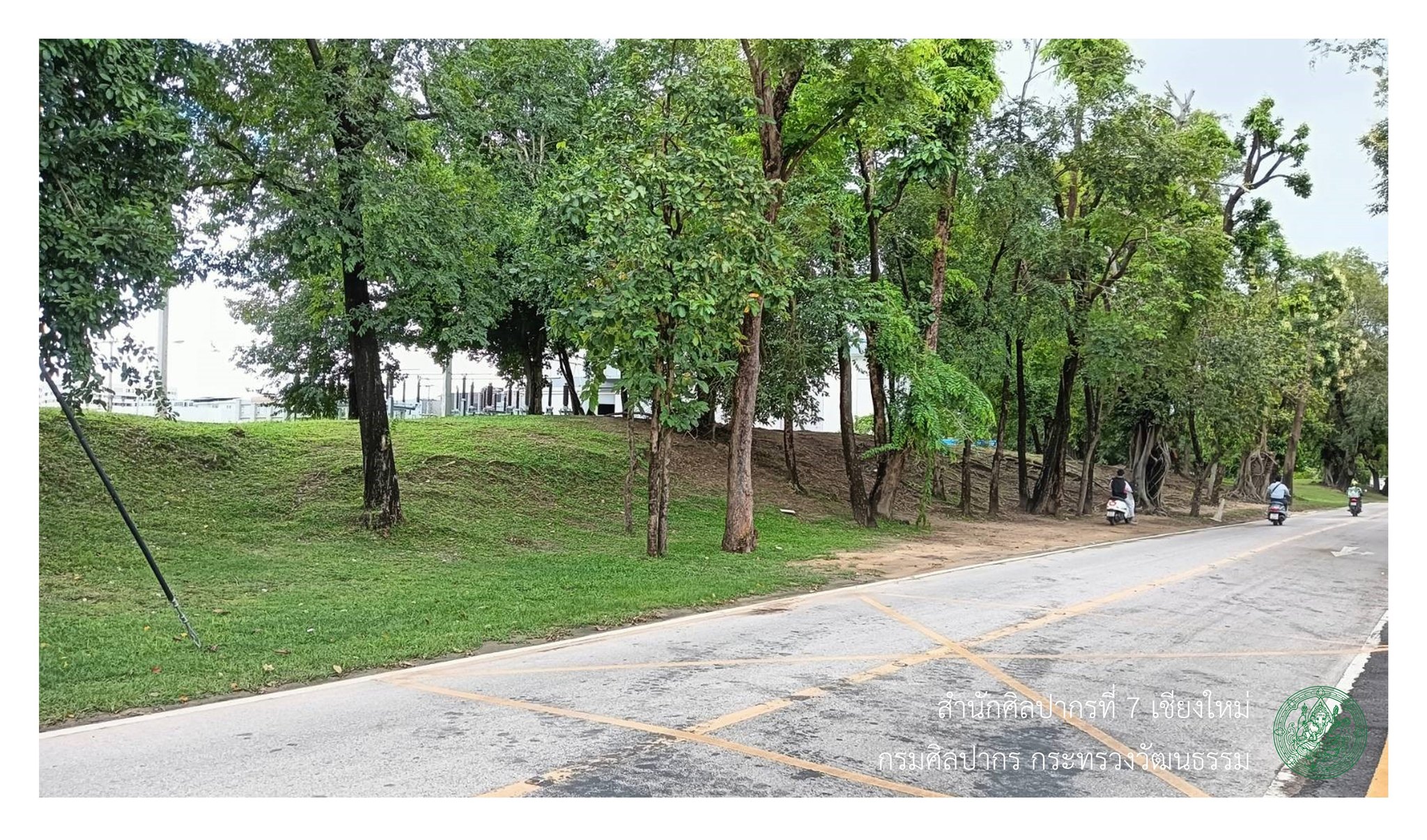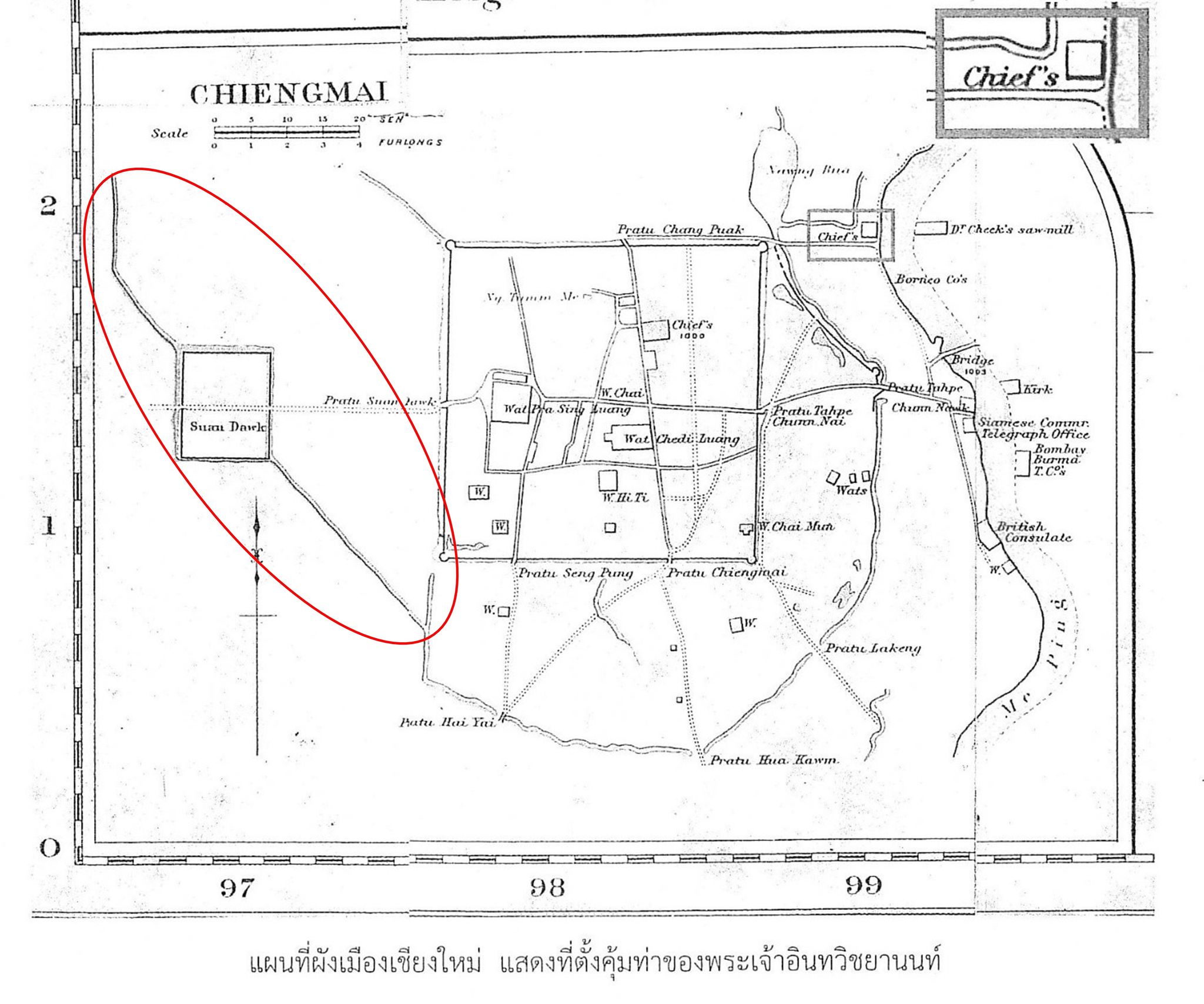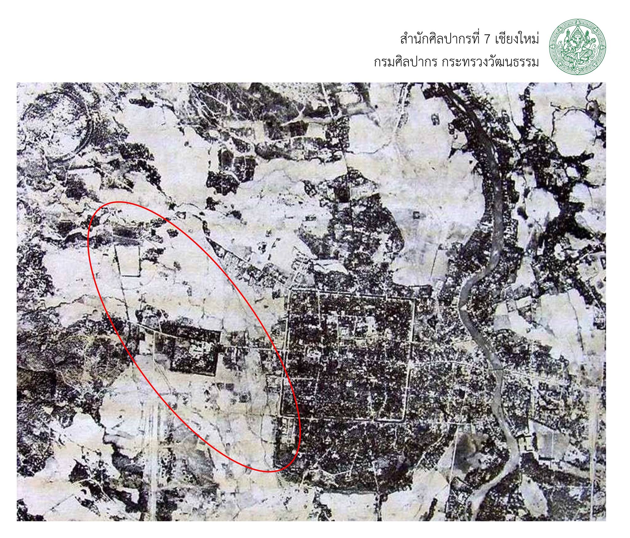 แผนที่ผังเมืองเชียงใหม่ ที่จัดทำขึ้นในสมัยรัชการที่ 5 แสดงให้เห็นแนวเส้นเชื่อมต่อระหว่างเวียงสวนดอกกับลำคูไหวทางตะวันตก และยังเห็นแนวเส้นอีกแนวที่เฉียงออกไปจากมุมด้านทิศตะวันตกเฉียงเหนือของวัดสวนดอก เมื่อเรานำภาพถ่ายทางอากาศเมืองเชียงใหม่และพื้นที่โดยรอบ พ.ศ.2497 มาพิจารณาเพิ่ม ก็จะเห็นภาพกว้างและพบบริบทที่มีนัยยะสำคัญมากขึ้น คือ แนวเส้นนั้นไปเชื่อมต่อกับแนวเส้นที่วางตัวในแนวเหนือใต้ที่อยู่เฉียงขึ้นไปอีก ที่สำคัญคือ แนวเส้นดังกล่าวนี้เป็นองค์ประกอบส่วนหนึ่งของคันดินรูปสี่เหลี่ยมที่ปัจจุบันตั้งอยู่ในมหาวิทยาลัยเชียงใหม่