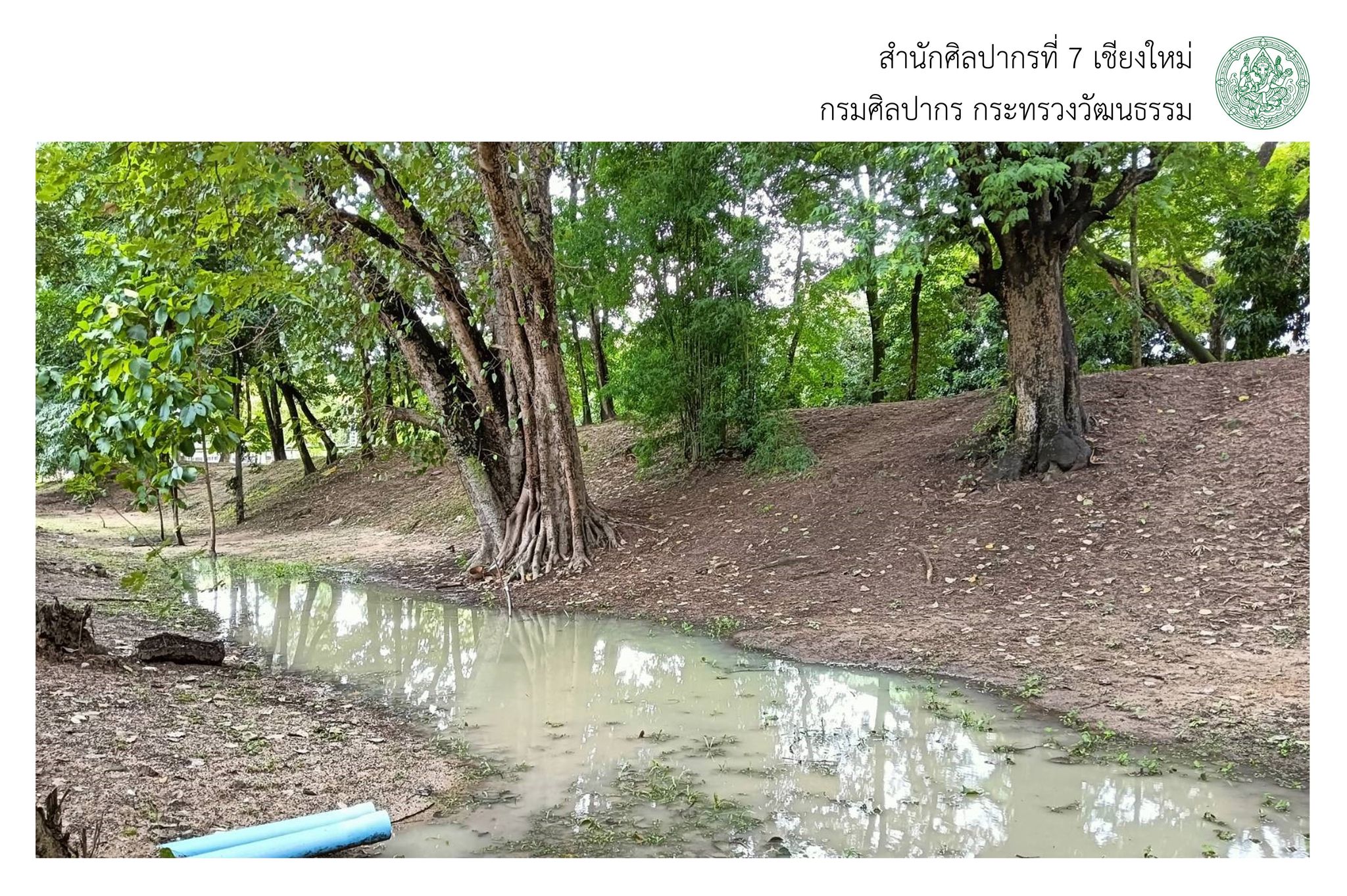 คันดินที่กล่าวถึงนี้ ปัจจุบันคือ คันดินที่สันนิษฐานว่าเป็นสันอ่างเก็บน้ำโบราณ ที่ตั้งอยู่ติดรั้วด้านทิศตะวันออกของมหาวิทยาลัยเชียงใหม่ ซึ่งเหลืออยู่สองจุด คือคันดินด้านตะวันตก ด้านหลังอาคารสนามกีฬาในร่ม และคันดินด้านตะวันออกที่อยู่ใกล้รั้วด้านตะวันออกของมหาวิทยาลัยโดยขนานไปกับแนวรั้ว อ่างเก็บน้ำโบราณนี้ทำหน้าที่เสมือนแก้มลิงที่รับน้ำที่หลากลงมาจากดอยสุเทพ อ่างเก็บน้ำนี้มีคันบังคับน้ำให้น้ำเลี่ยงออกไปทางทิศใต้ ไม่เข้าปะทะเมืองเชียงใหม่โดยตรง ทั้งนี้จะเห็นได้ว่าในแผนที่เมืองนครเชียงใหม่ ที่ประกอบในแผนที่แสดงพระราชอาณาเขตสยามและหัวเมืองประเทศราช พ.ศ.2443 แสดงให้เห็นว่าคันดินนี้เชื่อมต่อกับคูเวียงสวนดอกด้านทิศตะวันตกเฉียงเหนือ
