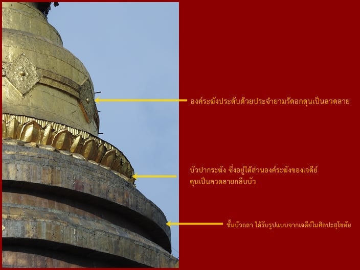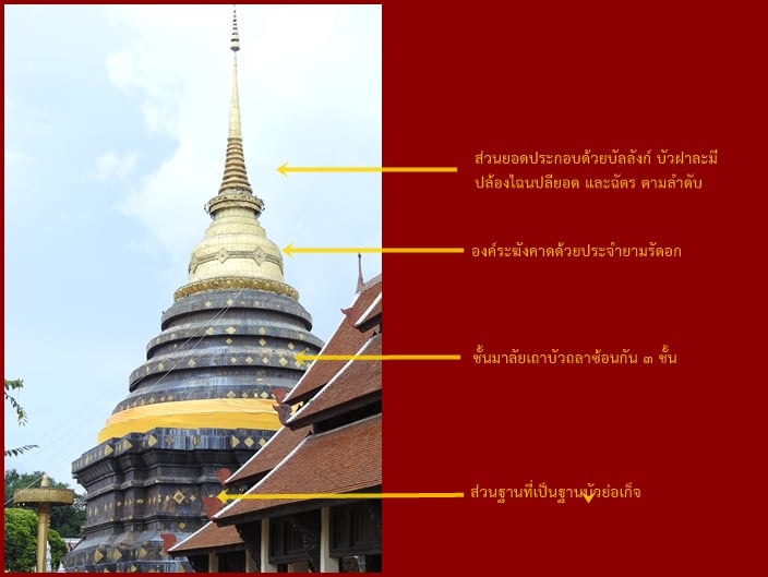 ___พระธาตุลำปางหลวงตั้งอยู่ภายในเขตพุทธาวาส พื้นเป็นลานทราย ล้อมรอบด้วยวิหารและระเบียงคดแสดงถึงคติจักรวาลของล้านนาโดยมีพระธาตุเป็นศูนย์กลาง รูปแบบของเจดีย์นั้น หุ้มด้วยแผ่นโลหะทั้งอค์ เป็นเจดีย์ทรงระฆังในพุทธศตวรรษที่ ๒๑ ประกอบด้วยฐานเป็นฐานบัวย่อเก็จ ต่อด้วยชั้นมาลัยเถาบัวถลาซ้อนกัน ๓ ชั้น อันเป็นอิทธิพลจากศิลปะสุโขทัยแพร่หลายขึ้นมายังล้านนาเมื่อคราวพระสุมนเถระขึ้นมาเผยแพร่พระพุทธศาสนา ที่บัวปากระฆังตกแต่งเป็นลายกลีบบัวมีเกสร ถัดขึ้นไปเป็นองค์ระฆังประดับด้วยประจำยามรัดอกดุนเป็นลวดลาย เหนือขึ้นไปเป็นบัลลังก์ต่อด้วยบัวฝาละมีประดับลายฉลุห้อยลงมาคล้ายฉัตรต่อด้วยปล้องไฉน ปลียอดตามลำดับ