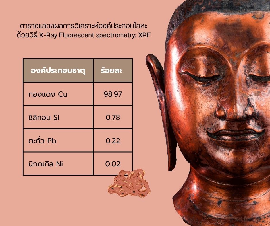 ผลการวิเคราะห์องค์ประกอบโลหะของพระพุทธรูปด้วยวิธีเอกซ์เรย์ฟลูออเรสเซนส์สเปคโทรเมตรี (X-Ray Fluorescent spectrometry; XRF) พบว่าพระพักตร์พระพุททธรูปมีส่วนประกอบของทองแดงในปริมาณที่สูงมาก ร้อยละ ๙๘.๙๗ ทำให้พระพักตร์พระพุทธรูปมีค่อนข้างออกเป็นสีแดง ส่วนโลหะอื่นๆที่ปรากฏนั้นคงเป็นโลหะชนิดอื่นๆที่ปะปนอยู่ในโลหะตามธรรมชาติ ที่ช่างสมัยก่อนยังไม่สามารถถลุงโลหะให้มีความบริสุทธิ์ได้