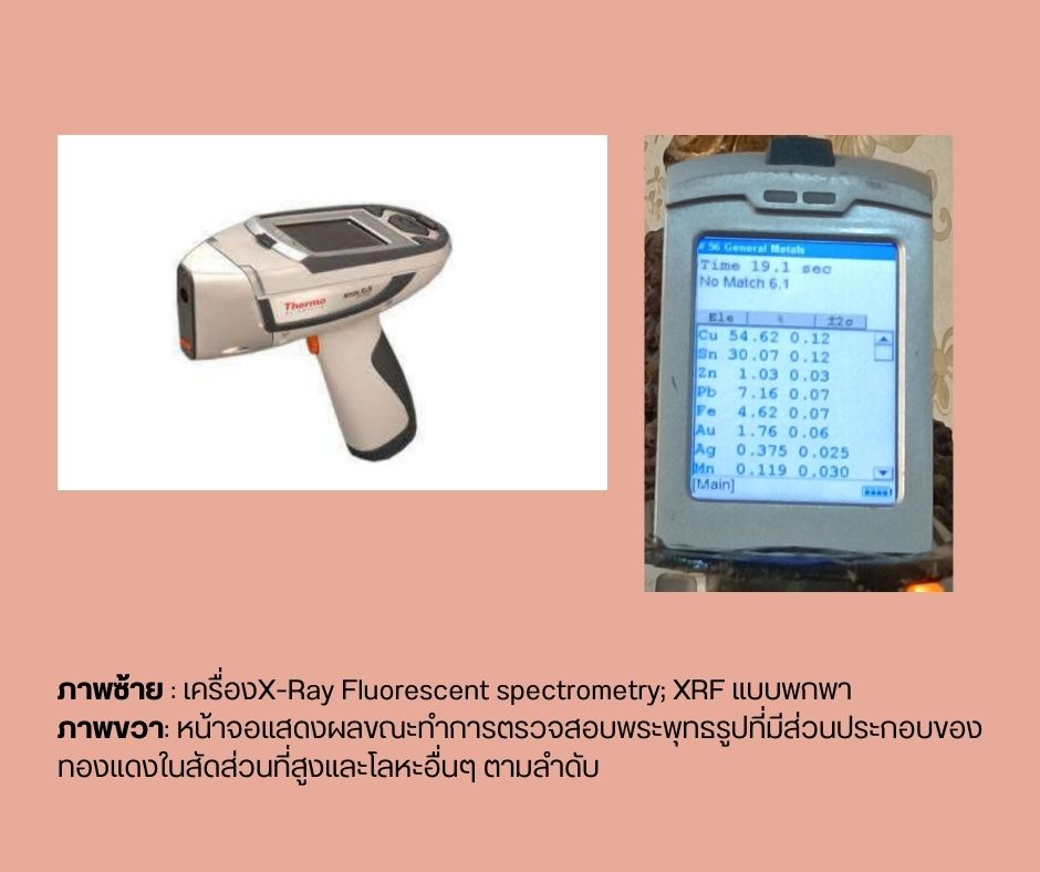 ปัจจุบัน กรมศิลปากร ได้มีการนำวิธีการทางวิทยาศาตร์หลากหลายวิธีในการวิเคราะห์หาค่าอายุและองค์ประกอบในโบราณวัตถุศิลปวัตถุควบคู่กับการศึกษาด้านรูปแบบทางศิลปะ เพื่อใช้ต่อยอดในการศึกษาและวิจัยในอนาคต หนึ่งในนั้นคือวิธีการ เอกซเรย์ฟลูออเรสเซนส์สเปคโทรเมตรี (X-ray Fluorescence spectrometry; XRF) คือเทคนิคการวิเคราะห์องค์ประกอบทางเคมีของวัสดุ แบบไม่ทำลายตัวอย่าง