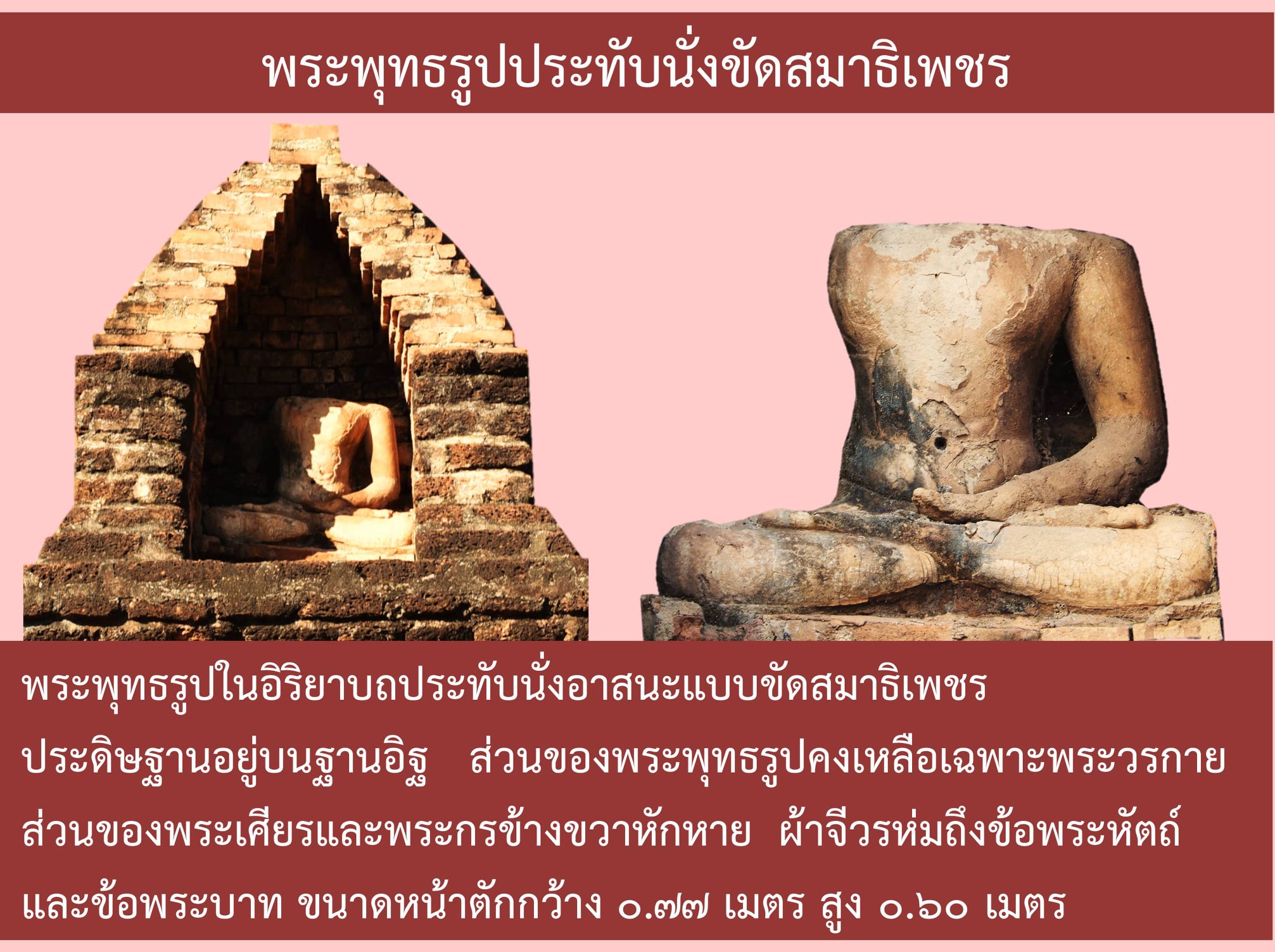 แบบขัดสมาธิเพชร จำนวน ๑ องค์ ประดิษฐานอยู่บนฐานอิฐ