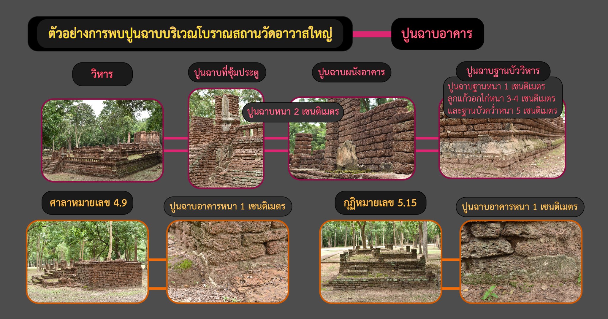 - ศาลาหมายเลข 4.1 และศาลาหมายเลข 4.6 พบปูนฉาบอาคารความหนาประมาณ 1 เซนติเมตร