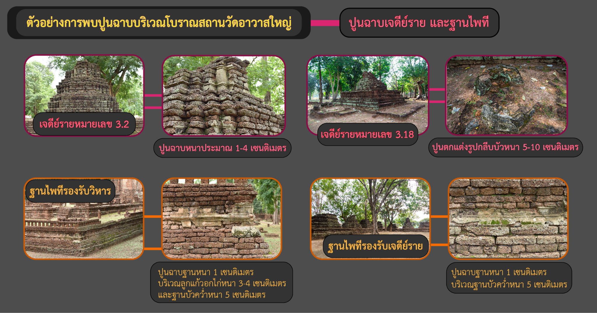 - บริเวณฐานไพทีรูปตัว “L” รองรับเจดีย์ราย พบปูนฉาบหนาประมาณ 1 เซนติเมตร และพบปูนฉาบบริเวณฐานบัว ส่วนลูกแก้วอกไก่หนา 3-4 เซนติเมตร ส่วนบัวคว่ำความหนาประมาณ 5 เซนติเมตร