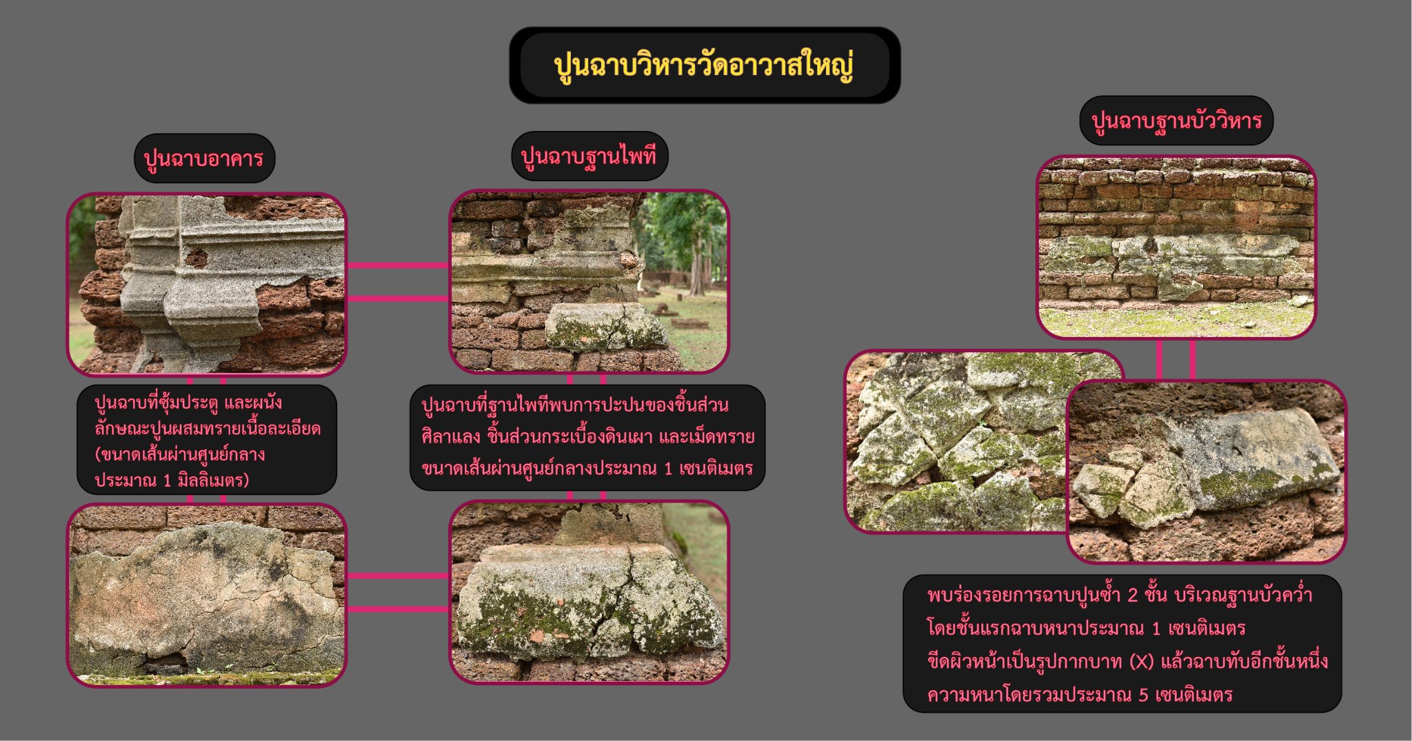 จากหลักฐานที่พบสันนิษฐานว่าปูนที่ใช้ฉาบตกแต่งอาคารวัดอาวาสใหญ่มีสองลักษณะคือ