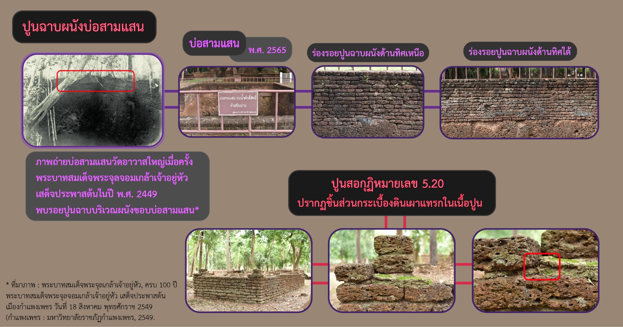 - บ่อสามแสน พบร่องรอยปูนฉาบบริเวณผนังทางด้านทิศเหนือ ทิศใต้ และทิศตะวันตก ซึ่งสอดคล้องกับภาพถ่ายเก่าสมัยรัชกาลที่ 5