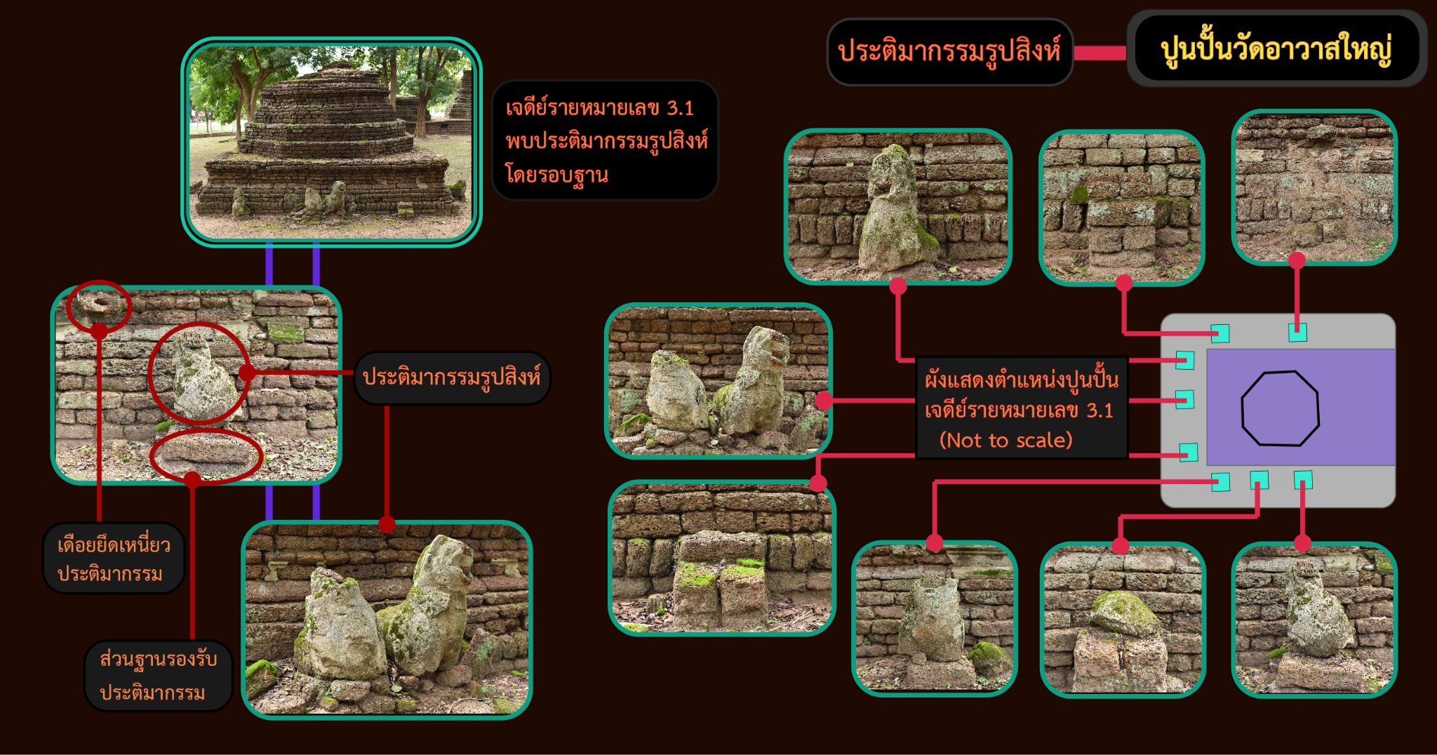- สิงห์ประดับฐานเจดีย์รายหมายเลข 3.1 (บนฐานไพทีรูปตัว L) บริเวณฐานไพทีพบแกนศิลาแลงยื่นออกมาจากตัวฐานซึ่งคาดว่าเป็นเดือยยึดประติมากรรมกับฐาน ประติมากรรมมีลักษณะเป็นโกลนศิลาแลงตกแต่งปูนปั้นสันนิษฐานว่าเป็นรูปสิงห์ จากร่องรอยแผงคอบริเวณส่วนหัว โดยปูนมีความหนาประมาณ 4-9 เซนติเมตร
