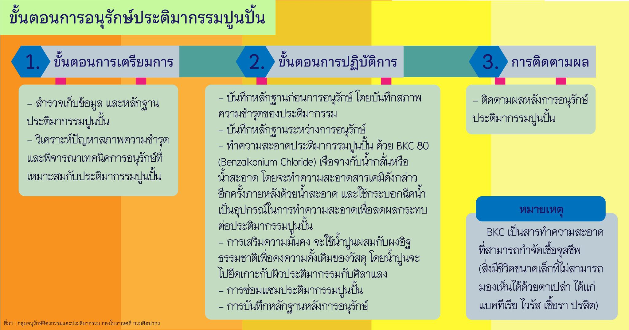 - การทำความสะอาดประติมากรรมปูนปั้น สารที่ใช้ในการทำความสะอาดเป็นสารเคมีที่มีชื่อว่า Benzalkonium Chloride หรือ BKC 80 เจือจางกับน้ำกลั่นหรือน้ำสะอาด