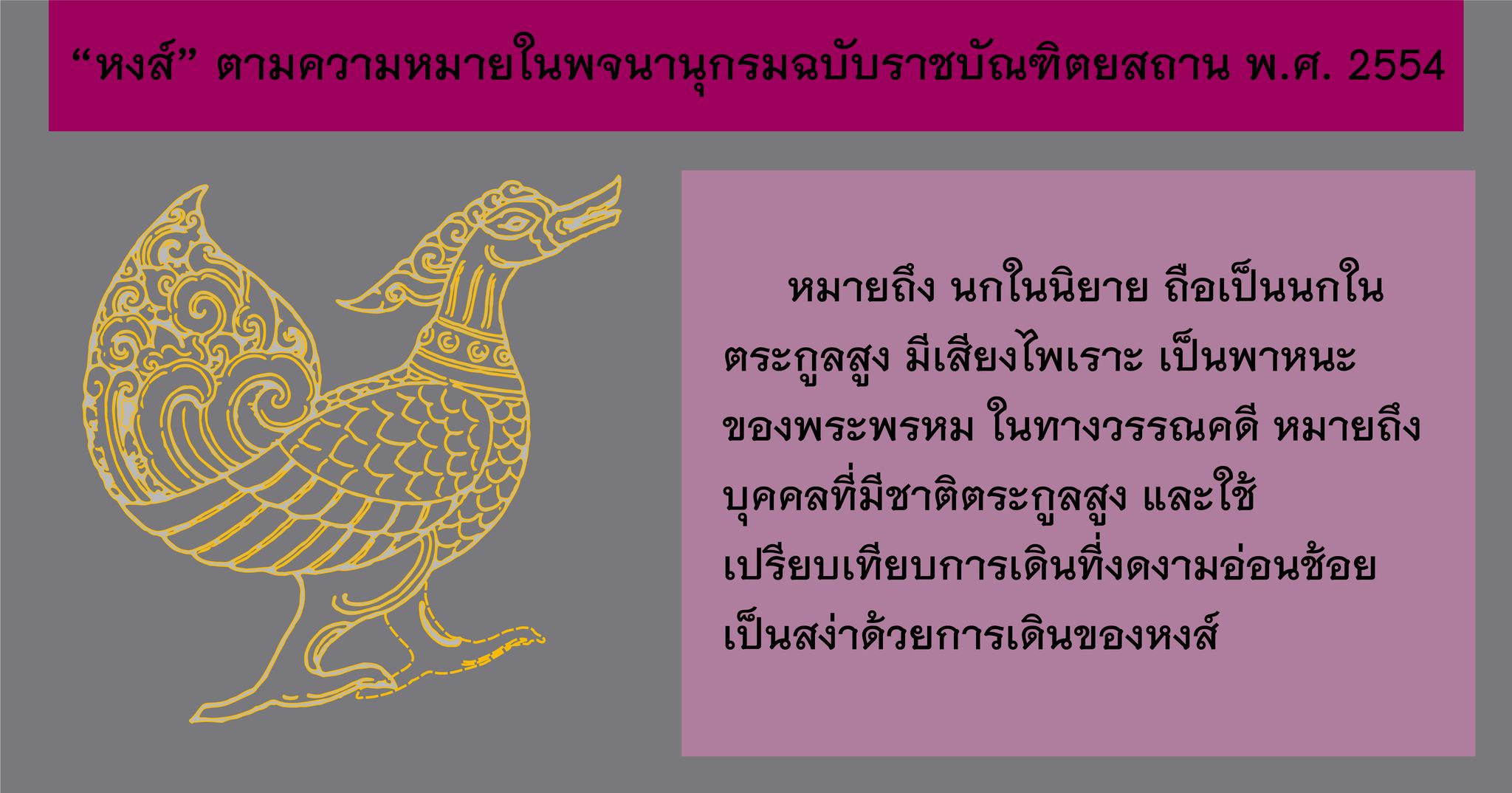 พจนานุกรมฉบับราชบัณฑิตยสถาน พ.ศ. 2554 ให้ความหมายว่า “หงส์” หมายถึง นกในนิยาย ถือเป็นนกในตระกูลสูง มีเสียงไพเราะ เป็นพาหนะของพระพรหม ในทางวรรณคดี หมายถึง บุคคลที่มีชาติตระกูลสูง และเปรียบการเดินที่งดงามอ่อนช้อยและเป็นสง่าด้วยการเดินของหงส์