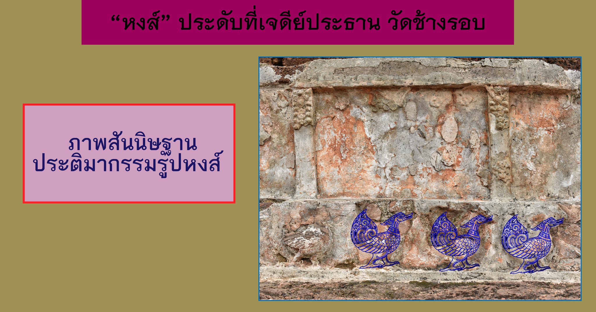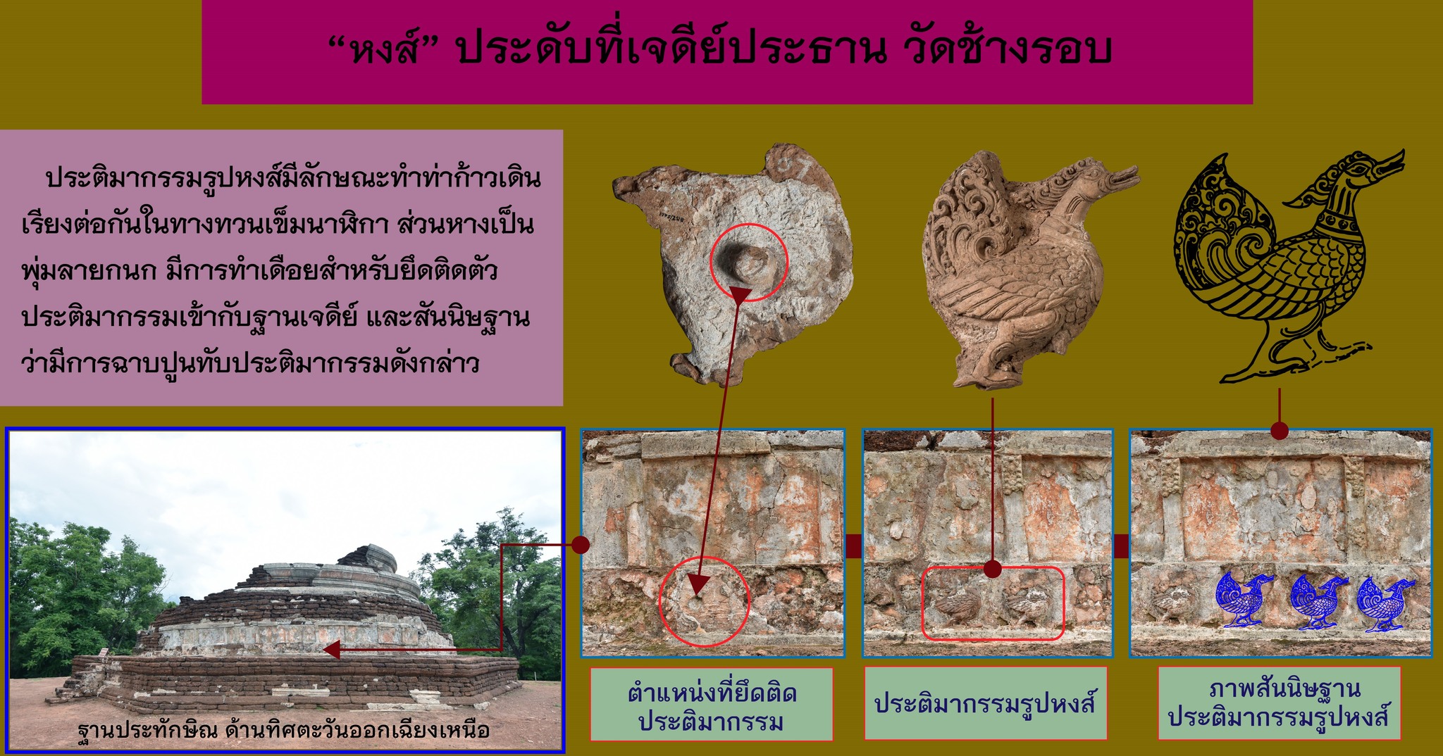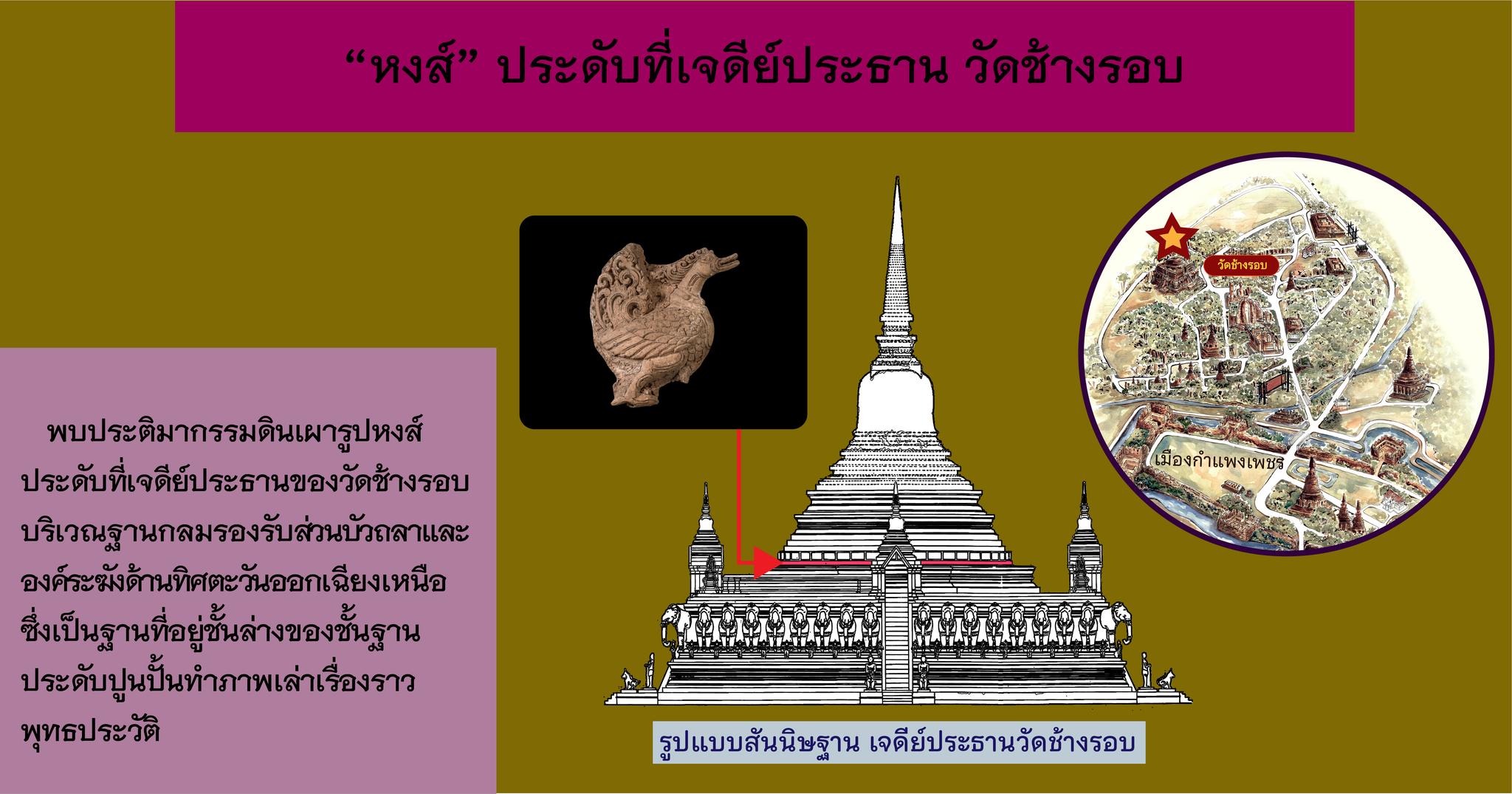 ที่เจดีย์ประธานวัดช้างรอบ บริเวณทิศเหนือนอกเมืองกำแพงเพชร พบประติมากรรมดินเผารูปหงส์ประดับที่เจดีย์ประธานของวัด บริเวณฐานกลมรองรับส่วนบัวถลาและองค์ระฆังด้านทิศตะวันออกเฉียงเหนือ ซึ่งเป็นฐานที่อยู่ชั้นล่างของชั้นฐานประดับปูนปั้นทำภาพเล่าเรื่องราวพุทธประวัติ ประติมากรรมรูปหงส์มีลักษณะทำท่าก้าวเดินเรียงต่อกันในทางทวนเข็มนาฬิกา ส่วนหางเป็นพุ่มลายกนก มีการทำเดือยสำหรับยึดติดตัวประติมากรรมเข้ากับฐานเจดีย์ และสันนิษฐานว่ามีการฉาบปูนทับประติมากรรมดังกล่าว