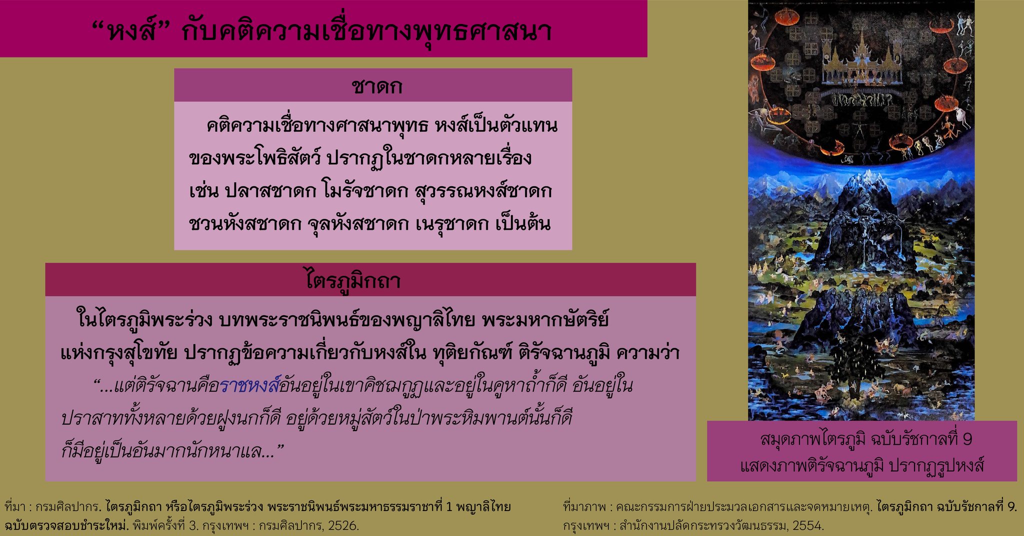 ในไตรภูมิพระร่วง บทพระราชนิพนธ์ของพญาลิไทย พระมหากษัตริย์องค์ที่ 6 แห่งกรุงสุโขทัย ปรากฏข้อความเกี่ยวกับหงส์ใน ทุติยกัณฑ์ ติรัจฉานภูมิ ความว่า “...แต่ติรัจฉานคือราชหงส์อันอยู่ในเขาคิชฌกูฏและอยู่ในคูหาถ้ำก็ดี อันอยู่ในปราสาททั้งหลายด้วยฝูงนกก็ดี อยู่ด้วยหมู่สัตว์ในป่าพระหิมพานต์นั้นก็ดี ก็มีอยู่เป็นอันมากนักหนาแล...”