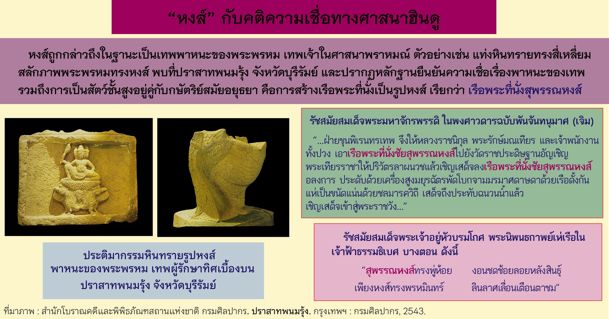 นอกจากนี้ยังถูกกล่าวถึงในฐานะเป็นเทพพาหนะของพระพรหม เทพเจ้าในศาสนาฮินดู ตัวอย่างเช่น แท่งหินทรายทรงสี่เหลี่ยมสลักภาพพระพรหมทรงหงส์ พบที่ปราสาทพนมรุ้ง จังหวัดบุรีรัมย์ และปรากฏหลักฐานยืนยันความเชื่อเรื่องพาหนะของเทพในศาสนาพราหมณ์ รวมถึงการเป็นสัตว์ชั้นสูงอยู่คู่กับกษัตริย์สมัยอยุธยา คือการสร้างเรือพระที่นั่งเป็นรูปหงส์ เรียกว่า เรือพระที่นั่งสุพรรณหงส์ หรือสุวรรณหงส์ ดังที่เจ้าฟ้าธรรมธิเบศทรงพรรณนาถึงโดยเปรียบเทียบกับพาหนะของพระพรหม จากพระนิพนธ์กาพย์เห่เรือบางตอนไว้ว่า