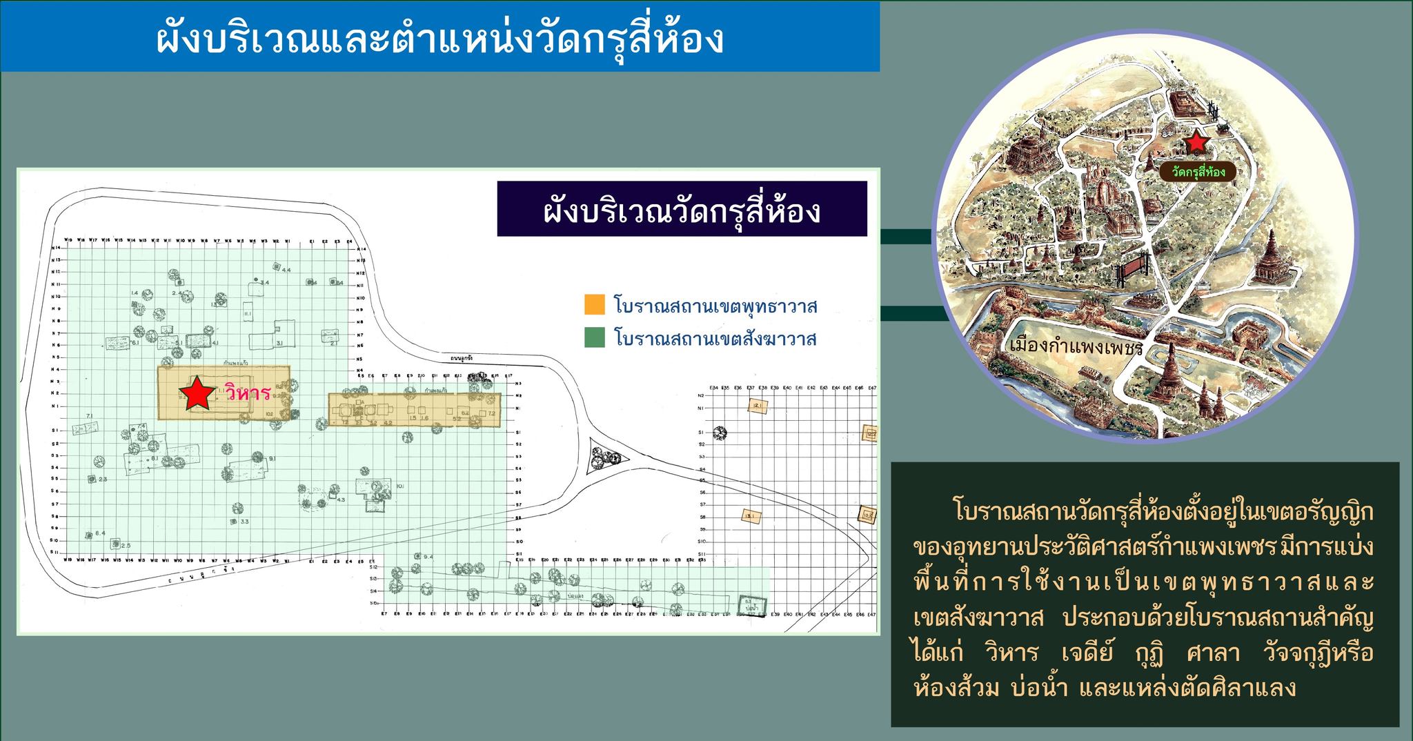 โบราณสถานวัดกรุสี่ห้อง ตั้งอยู่ในเขตอรัญญิกของอุทยานประวัติศาสตร์กำแพงเพชร มีการแบ่งพื้นที่การใช้งานเป็นเขตพุทธาวาสและเขตสังฆาวาส ประกอบด้วยโบราณสถานสำคัญ ได้แก่ วิหาร เจดีย์ กุฏิ ศาลา วัจจกุฎีหรือห้องส้วม บ่อน้ำ และแหล่งตัดศิลาแลง
