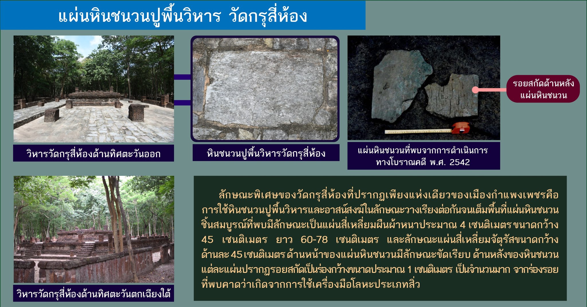 ลักษณะพิเศษของวัดกรุสี่ห้องที่ปรากฏเพียงแห่งเดียวของเมืองกำแพงเพชรคือ การใช้หินชนวนปูพื้นวิหารและอาสน์สงฆ์ในลักษณะวางเรียงต่อกันจนเต็มพื้นที่ โดยแผ่นหินชนวนชิ้นสมบูรณ์ที่พบจากการดำเนินการทางโบราณคดีปีงบประมาณ 2542 มีลักษณะเป็นแผ่นสี่เหลี่ยมผืนผ้าหนาประมาณ 4 เซนติเมตร ขนาดกว้าง 45 เซนติเมตร ยาว 60-78 เซนติเมตร และลักษณะแผ่นสี่เหลี่ยมจัตุรัสขนาดกว้างด้านละ 45 เซนติเมตร ด้านหน้าของแผ่นหินชนวนมีลักษณะขัดเรียบ ด้านหลังของหินชนวนแต่ละแผ่นปรากฏรอยสกัดเป็นร่องกว้างขนาดประมาณ 1 เซนติเมตร เป็นจำนวนมาก จากร่องรอยที่พบคาดว่าเกิดจากการใช้เครื่องมือโลหะประเภทสิ่ว ใช้สำหรับเพิ่มการยึดเกาะปูนที่เป็นตัวประสาน