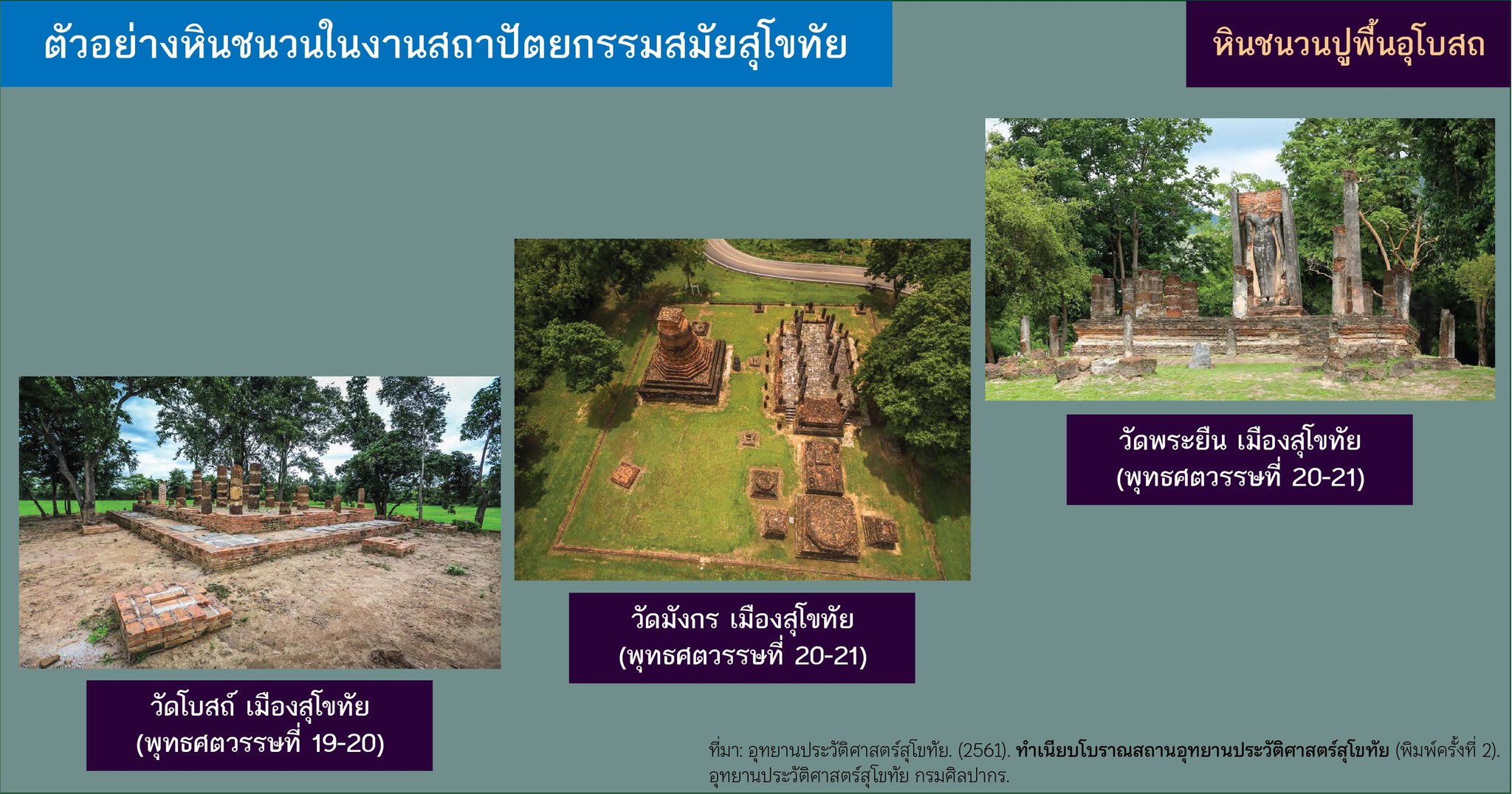 โบราณสถานวัฒนธรรมสุโขทัยปรากฏร่องรอยการนำหินชนวนมาใช้ประกอบสถาปัตยกรรมอย่างหลากหลาย โดยในเมืองสุโขทัยพบการปูพื้นด้วยหินชนวนทั้งในลักษณะปูพื้นวิหาร เช่น วัดศรีสวาย (พุทธศตวรรษที่ 18) วัดเจดีย์งาม (พุทธศตวรรษที่ 19-20) วัดเขาพระบาทน้อย (พุทธศตวรรษที่ 19-22) ปูพื้นอุโบสถ เช่น วัดโบสถ์ (พุทธศตวรรษที่ 19-20) วัดมังกร (พุทธศตวรรษที่ 20-21) วัดพระยืน (พุทธศตวรรษที่ 20-21) นอกจากนี้ที่วัดเชตุพน (พุทธศตวรรษที่ 19-22) ยังพบการนำหินชนวนมาใช้ปูพื้นและเป็นวัสดุก่อสร้างกำแพงล้อมรอบมณฑปประธาน สร้างช่องประตูทางเข้าด้วยหินชนวนแท่งใหญ่ รวมถึงนำมาปูพื้นโดยรอบวิหาร และเขาพระบาทใหญ่ (พุทธศตวรรษที่ 20-22) พบการปูพื้นด้วยหินชนวนบนวิหารและพื้นที่โดยรอบ