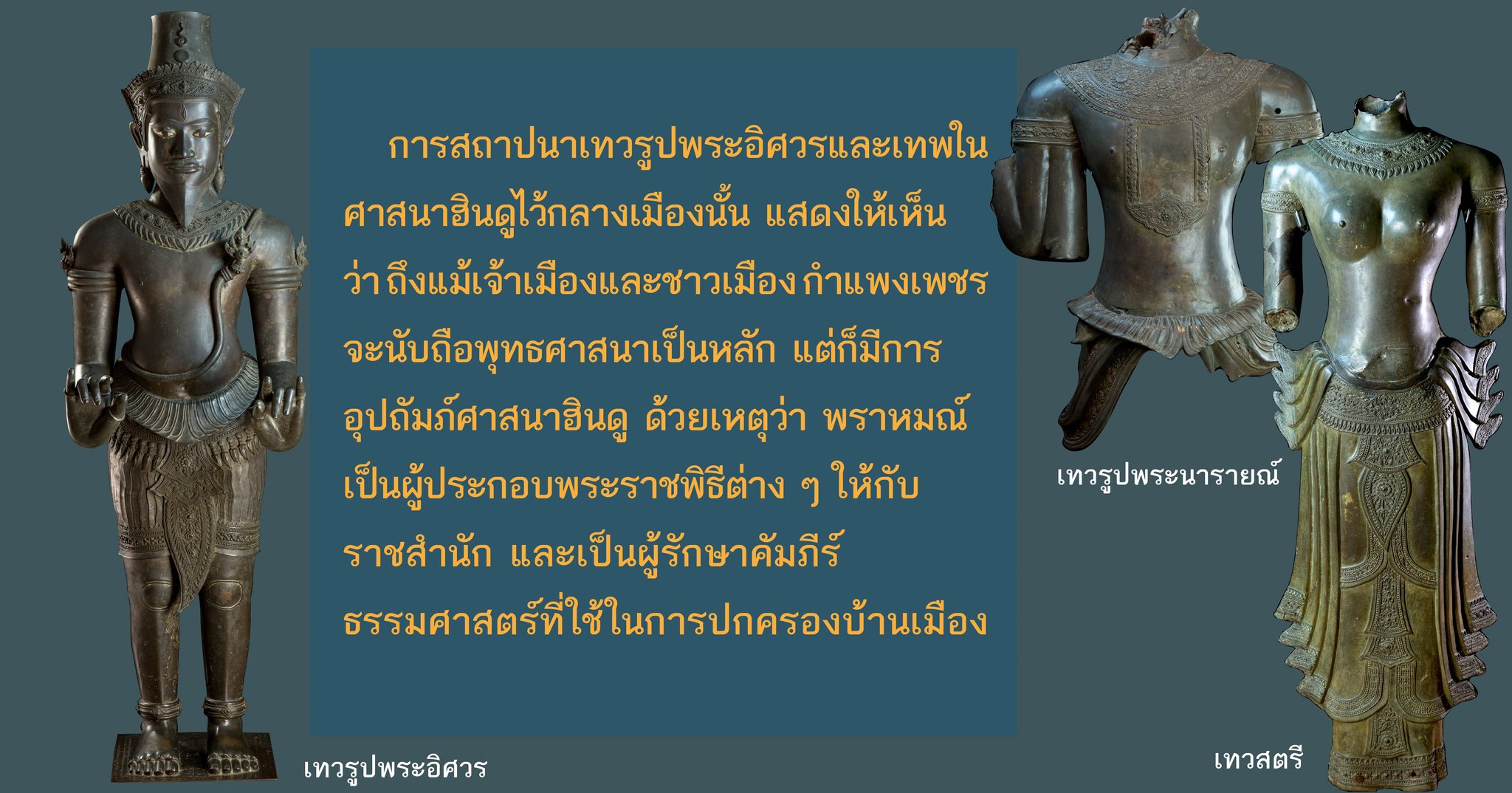 การสถาปนาเทวรูปพระอิศวรและเทพในศาสนาฮินดูไว้กลางเมืองนั้น แสดงให้เห็นว่า ถึงแม้เจ้าเมืองและชาวเมืองกำแพงเพชรจะนับถือพุทธศาสนาเป็นหลัก แต่ก็มีการอุปถัมภ์ศาสนาฮินดู ด้วยเหตุว่าพราหมณ์เป็นผู้ประกอบพระราชพิธีต่างๆให้กับราชสำนัก และเป็นผู้รักษาคัมภีร์ธรรมศาสตร์ที่ใช้ในการปกครองบ้านเมือง