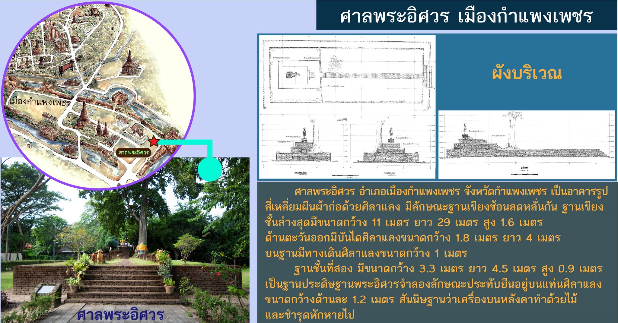 ศาลพระอิศวร อำเภอเมืองกำแพงเพชร จังหวัดกำแพงเพชร กำหนดอายุได้พุทธศตวรรษที่ 21 จากจารึกรอบฐานเทวรูปพระอิศวรระบุปี พ.ศ. 2053 เป็นอาคารรูปสี่เหลี่ยมผืนผ้าก่อด้วยศิลาแลง มีลักษณะฐานเขียงซ้อนลดหลั่นกัน ฐานเขียงชั้นล่างสุดมีขนาดกว้าง 11 เมตร ยาว 29 เมตร สูง 1.6 เมตร ด้านตะวันออกมีบันไดศิลาแลงขนาดกว้าง 1.8 เมตร ยาว 4 เมตร บนฐานมีทางเดินศิลาแลงขนาดกว้าง 1 เมตร เป็นแนวยาวไปจนถึงบันไดสู่ฐานชั้นที่สอง