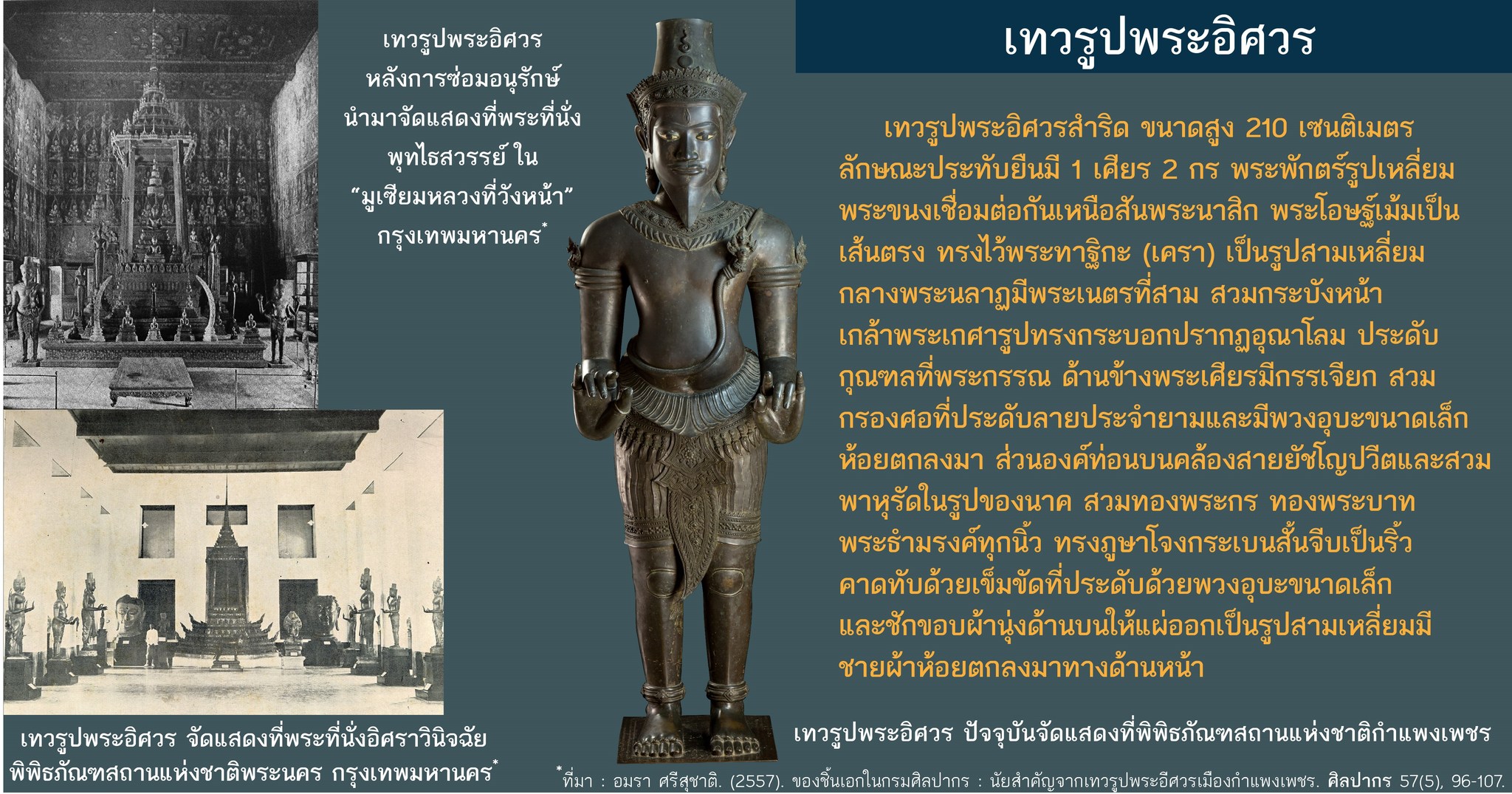 เมื่อ พ.ศ. 2426 เทวรูปพระอิศวรถูกลักลอบตัดพระเศียรและพระกรทั้งสองข้างโดยชาวเยอรมันชื่อนายรัสมันต์ (J.E. Rastmann) เพื่อนำออกนอกประเทศ แต่กงสุลเยอรมันไม่เห็นชอบด้วยจึงอายัดไว้ พร้อมทั้งแจ้งให้ฝ่ายไทยทราบ หลังจากนั้น พระบาทสมเด็จพระจุลจอมเกล้าเจ้าอยู่หัว (รัชกาลที่ 5) ทรงมีรับสั่งให้พระองค์เจ้าประดิษฐ์วรการ อธิบดีกรมช่างสิบหมู่ นำพระเศียรและพระกรเชื่อมติดกับองค์เทวรูปดังเดิม เมื่อมีการจัดตั้งมิวเซียมหลวงในบริเวณพระราชวังบวรสถานมงคล ได้อัญเชิญเทวรูปพระอิศวรมาประดิษฐานไว้ที่พระที่นั่งพุทไธสวรรย์ ต่อมามีการย้ายองค์เทวรูปไปจัดแสดงในพระที่นั่งอิศราวินิจฉัยในสมัยพระบาทสมเด็จพระปกเกล้าเจ้าอยู่หัว (รัชกาลที่ 7) และในปี พ.ศ. 2514 จึงอัญเชิญมาจัดแสดงที่พิพิธภัณฑสถานแห่งชาติกำแพงเพชร