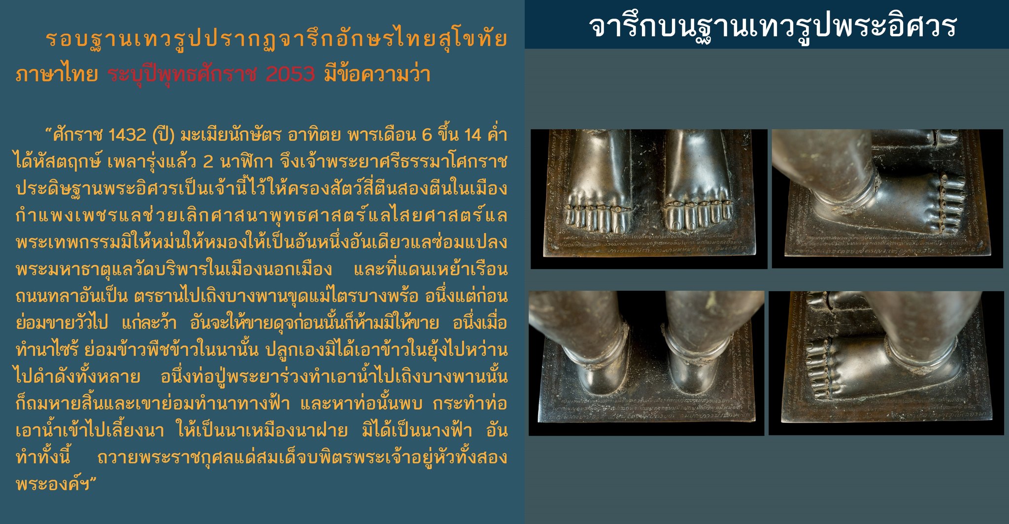 เทวรูปพระอิศวรสำริด ขนาดสูง 210 เซนติเมตร ลักษณะประทับยืนมี 1 เศียร 2 กร พระพักตร์รูปเหลี่ยม พระขนงเชื่อมต่อกันเหนือสันพระนาสิก พระโอษฐ์เม้มเป็นเส้นตรง ทรงไว้พระทาฐิกะ (เครา) เป็นรูปสามเหลี่ยม กลางพระนลาฏมีพระเนตรที่สาม สวมกระบังหน้า เกล้าพระเกศารูปทรงกระบอกปรากฏอุณาโลม ประดับกุณฑลที่พระกรรณ ด้านข้างพระเศียรมีกรรเจียก สวมกรองศอที่ประดับลายประจำยามและมีพวงอุบะขนาดเล็กห้อยตกลงมา ส่วนองค์ท่อนบนคล้องสายยัชโญปวีตและสวมพาหุรัดในรูปของนาค สวมทองพระกร ทองพระบาท พระธำมรงค์ทุกนิ้ว ทรงภูษาโจงกระเบนสั้นจีบเป็นริ้ว คาดทับด้วยเข็มขัดที่ประดับด้วยพวงอุบะขนาดเล็ก และชักขอบผ้านุ่งด้านบนให้แผ่ออกเป็นรูปสามเหลี่ยมมีชายผ้าห้อยตกลงมาทางด้านหน้า รอบฐานเทวรูปปรากฏจารึกอักษรไทยสุโขทัย ภาษาไทย ระบุปีพุทธศักราช 2053 มีข้อความว่า